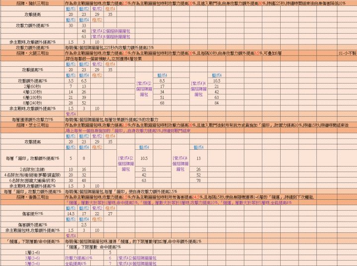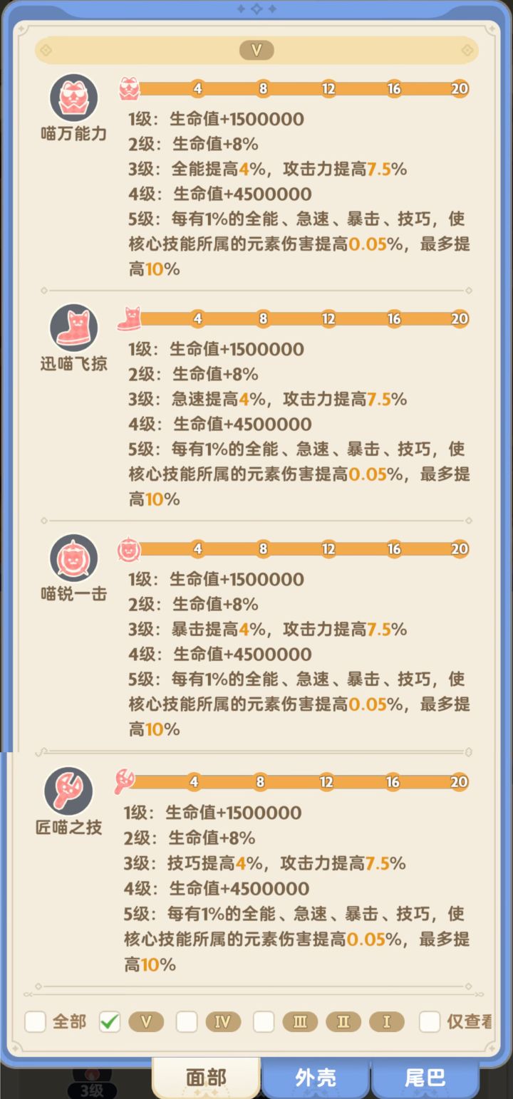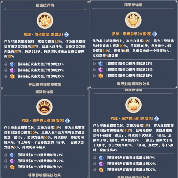 5代猫技能加成表格、3-5代猫所需材料表格