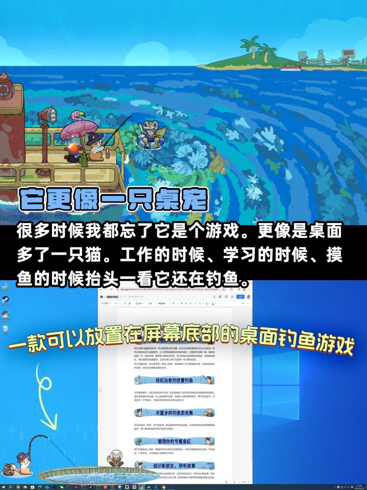 最近发现的一款放置类钓鱼休闲游戏,主角是一只可爱的猫猫菲舍(Fischer),可以静静陪你工作 / 学习 / 摸鱼 🌞🌧。✨ 游戏特色✅ 自动钓鱼,零操作难度✅ 可设为动态壁纸 / 桌面伴侣✅ 悠闲钓鱼 + 多图鉴收集✅ 手绘风场景 + 天气/昼夜变换✅ 升级装备 / 解锁新鱼种 / 装饰鱼缸✅ 与NPC交流,触发小故事玩法核心不是按键操作,而是“陪伴感”:把菲舍放屏幕角落,它自己