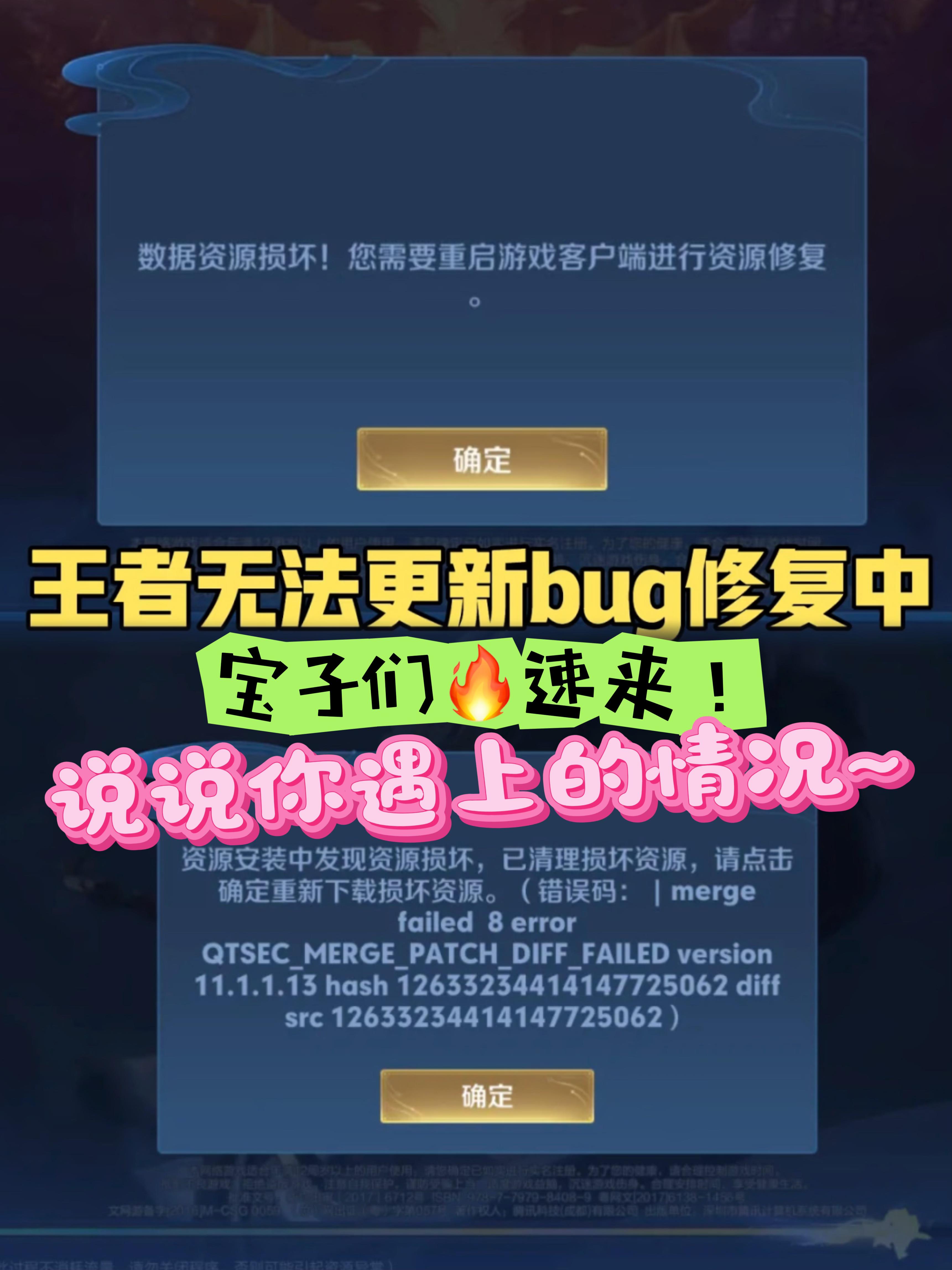 🐛王者荣耀数据资源损坏 近日,腾讯旗下国民级社交手游 王者荣耀 出现大量玩家反馈 玩家反馈称游戏服务器出现 Bug,在对局中显示游戏资源损坏,重启无效 对于玩家们 的反馈,官方已于近日留言,内容如下 “亲爱的召唤师:我们收到反馈,对局内可能出现数据资源损坏异常,我们正在定位中,将尽快修复上线。非常抱歉给各位玩家带来不便,感谢您对《王者荣耀》的支持与理解。” 👁部分玩家体验遭受影响 据悉,部分玩家表