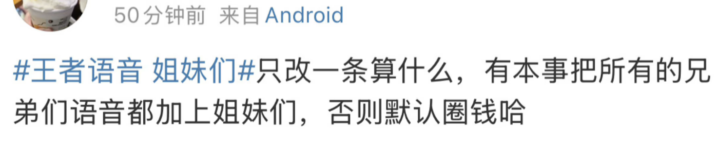 万万没想到,王者荣耀再次因为语音包问题被冲上热搜!现在评论区热度爆炸,纷纷要要讨个说法!由于王者里面的语音包越出越多,基本上所有的快捷语音全都是以兄弟们概括整个游戏群体。 结果这事儿让不少女玩家心里特别不得劲,纷纷觉得搞区别对待! 要知道游戏里女玩家本来就不少,有许多流水完全靠着女玩家来支撑,购买那些可爱的皮肤、小兵皮等等。结果局内想喊队友配合,刷出来的不是 兄弟们冲就是兄弟们稳住,于是
