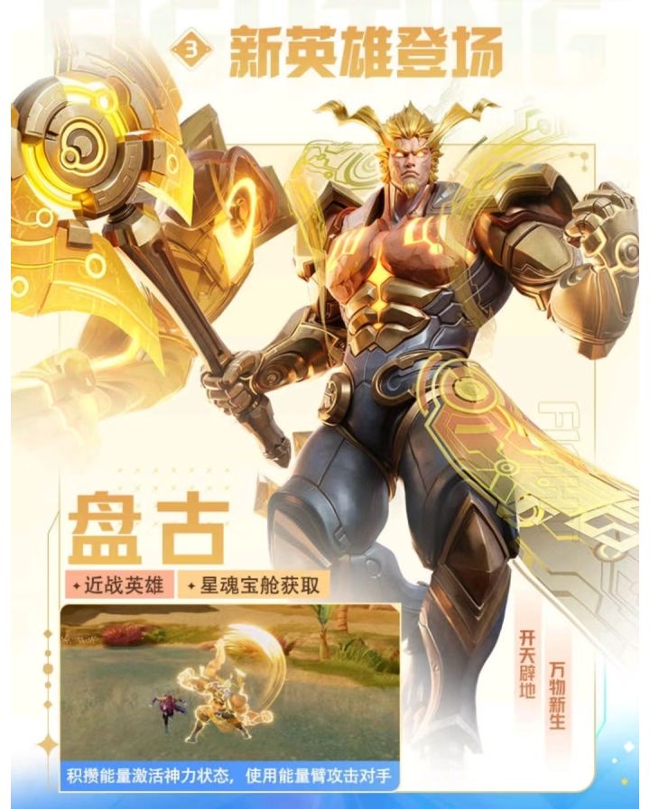王者荣耀星之破晓星魂战场明天更新:✅李白碎月剑心新皮肤即将上线✅继红buff之后,蓝buff也来破晓了哈哈哈✅新的灵宝鬼谷崽上线可以让自己和队友隐身,也可以拉人吸人✅新英雄盘古即将上线普通攻击:挥动斧头造成伤害蓄力普攻:向前跳跃攻击,伤害更高强化普攻:召唤能量臂对攻击敌人,金身护体主动技能:对敌人缴械,使其无法普攻#王者荣耀星之破晓 #星之破晓 #王者破晓星魂战场 #王者荣耀