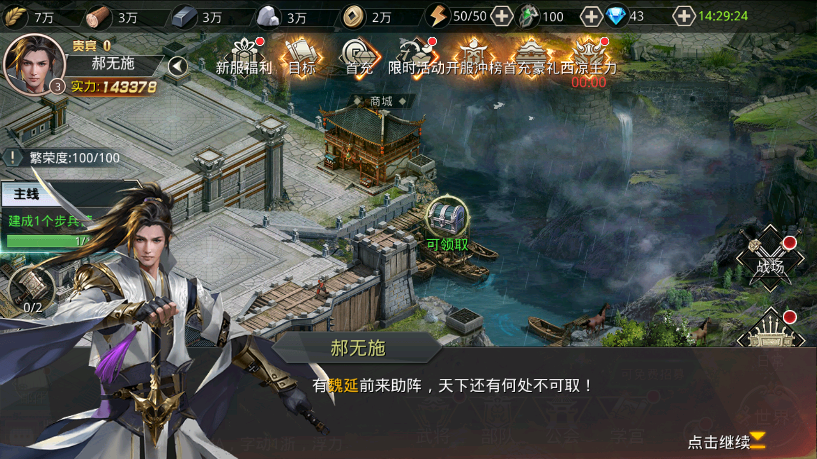 尊敬的主公,您好!!!欢迎来到《王者纷争》!作为新手,您将踏上策略与冒险的征程。游戏中,您需要招募英雄、建设强大的王国,并与其他玩家展开激烈的对战。首先,完成新手任务,以了解基础操作和游戏机制,请主公们跟着下面的内容快速的过一下新手指引,以便更加快速打造出属于您的国家!!!注册登入游戏后,选择想要加入的阵营过剧情后选择陪主公一起战斗的梦中女神正式进入游戏,根据提示重开基业,成就您的霸业!