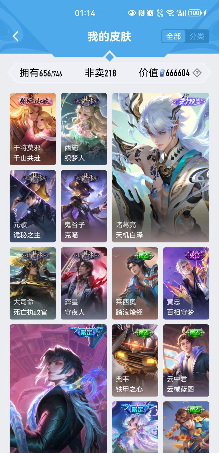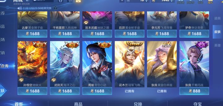 周瑜没皮肤,达摩改版后就不爱玩了,干将不会玩,李元芳不好玩,孙悟空有史诗皮,没有武则天,梦奇有史诗皮