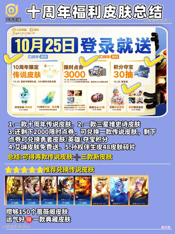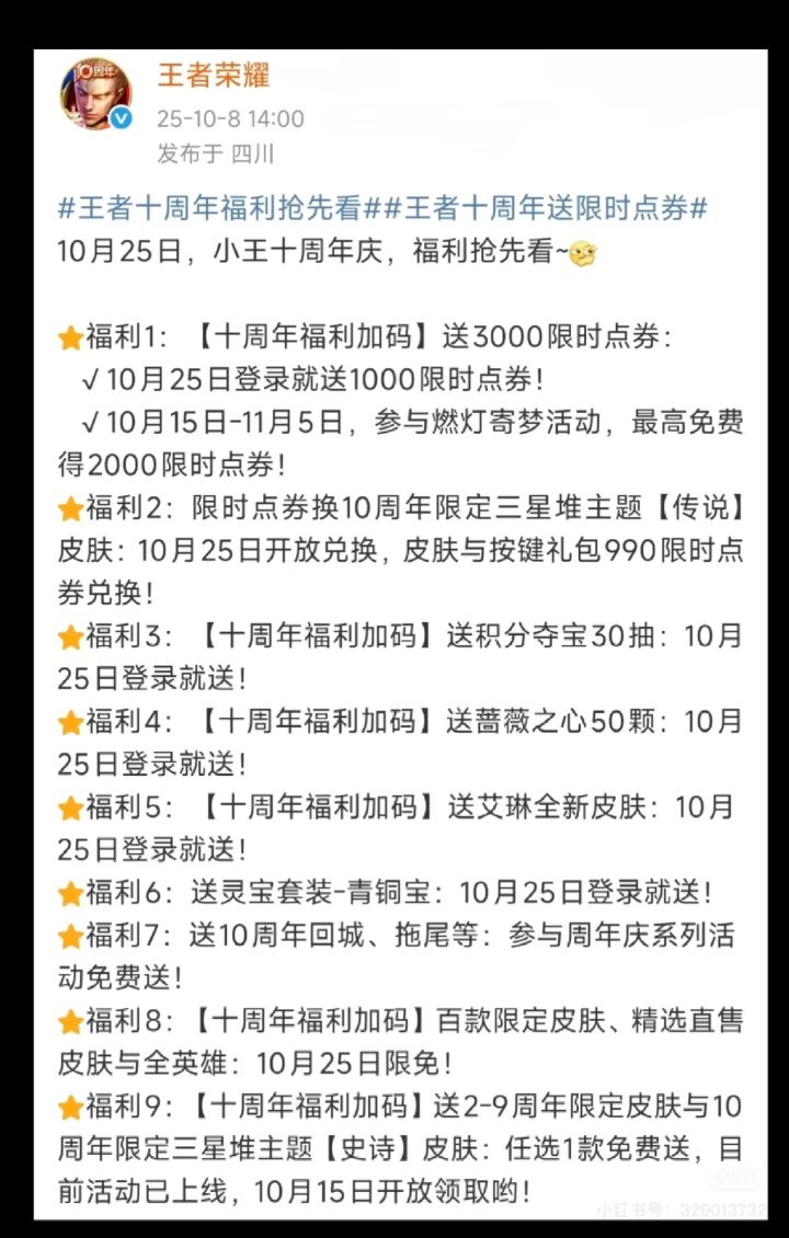 这还是这还是我们认识的那个小王吗1:10月25日登陆无条件送1000限时点券做后做后续任务累计可获得3000限时点券2:10月25日登陆无条件再送30积分夺宝券3:10月25日登陆限定换传说皮肤4:50颗蔷薇之心5:艾琳新皮肤6:灵宝套装青铜宝7:2~10周年限定皮肤任选8:百款限定皮肤和直售皮肤免费使用#王者荣耀 #游戏安利 #游戏推荐 #游戏讨论 #游戏资讯 #二次元 #天