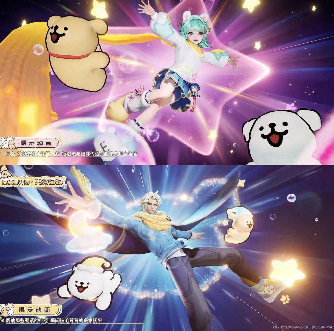 🤔这次联动完美拿捏线条小狗“简约治愈”的核心精髓,建模把软萌感焊在了身上:‼️小乔化身「马尔济斯甜妹」,粉白渐变双马尾缀着毛绒小狗耳饰,裙摆是蓬蓬云朵质感,腰间挂着周瑜迷你玩偶暗藏双向奔赴小心机,武器直接换成印满线条小狗的软萌枕头,挥动时自带“簌簌”的梦幻音效,甜妹属性拉满!‼️周瑜对应「金毛暖男」设定,银白渐变发色搭配星空蓝黄撞色服饰,围巾和披风上藏着马尔济斯英文暗纹,武器变身温柔月亮小夜灯