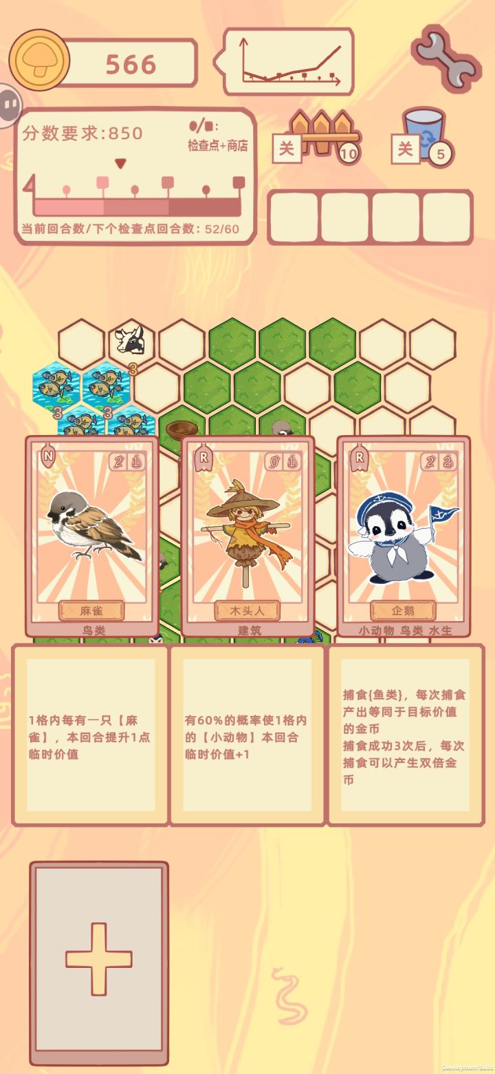 游戏终于上线了!打了一局分享给大家! 开局思路先放两只兔子相邻,让它们自行繁殖扩大数量,然后开始抽卡。前几轮抽到了夜鹭,鸟类在湿地上会获得加成,所以直接部署,并花了一回合控制夜鹭踩上湿地,增加金币同时成功获得鸟蛋! 小牛也是成长型单位,早期拿可以早点长大产牛奶。进入商店刷了个木头人,可以强化附近的【小动物】,决定前期走小动物流派,让兔子多繁衍然后吃到木头人的加成,成功突破春天的两个检查点。 来到夏