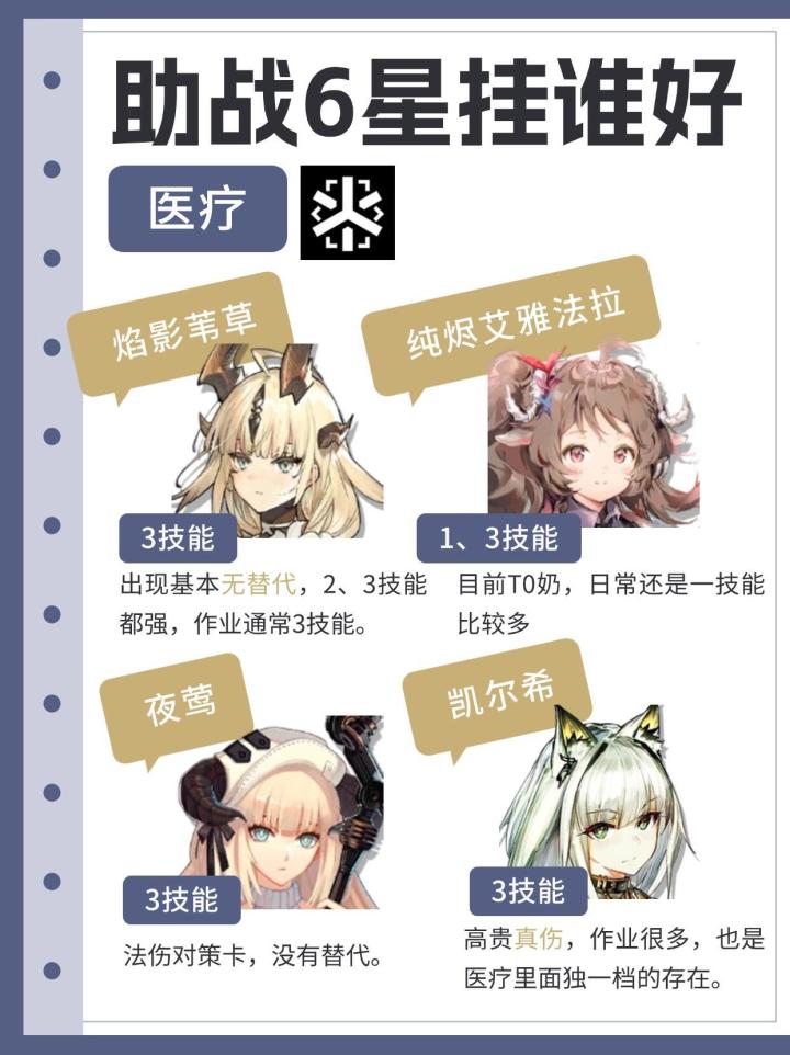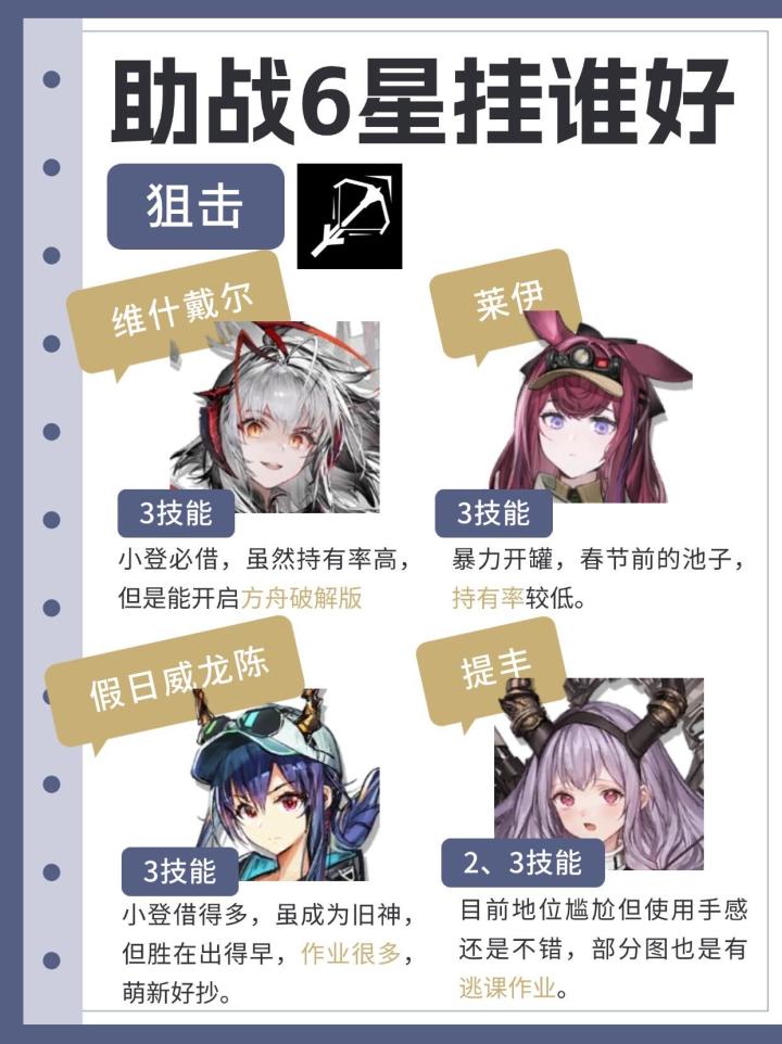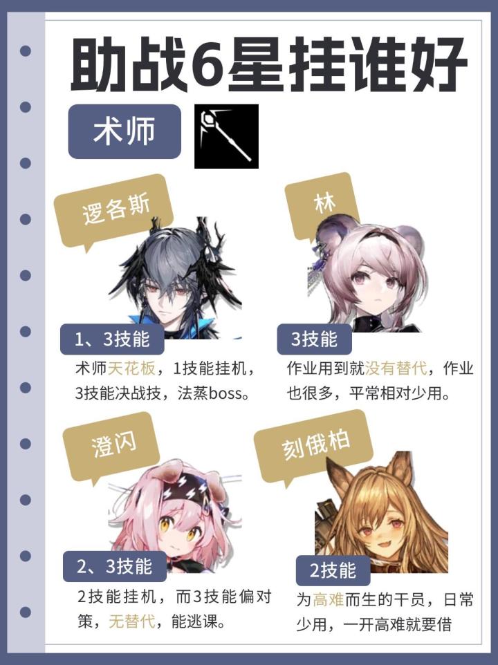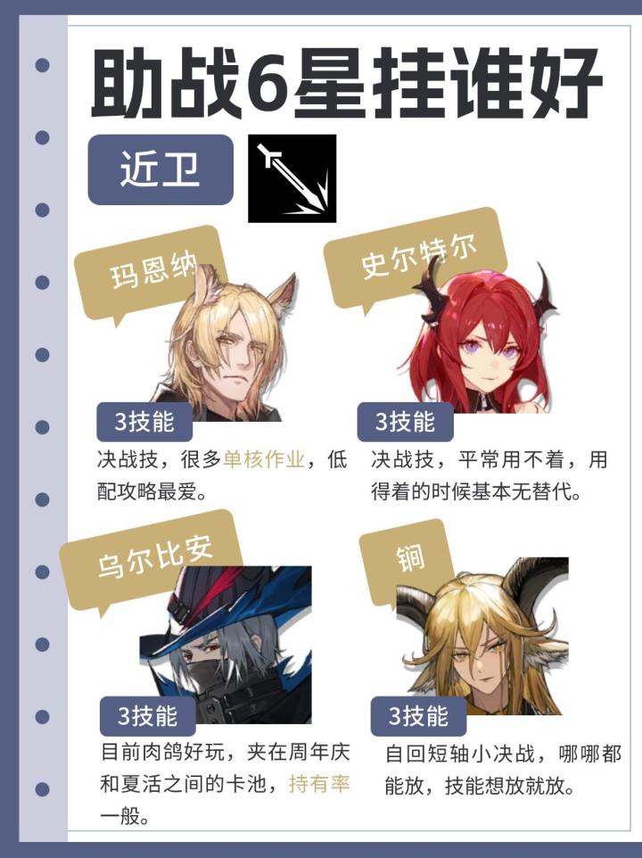 博士们是按照什么标准放助战的呢?有没有希望通过助战加到更多好友?本期就来盘点各个职业的6星哪些更容易被借吧!PS:新人博士记得在20级之前借助战干员,至少把推荐的干员都借一遍,因为20级之前可以刷到满级大佬的干员。偏个人经验总结,欢迎补充和在本帖现场互助~#明日方舟 #明日方舟迷宫饭联动 #新手攻略 #明日方舟攻略 #玛恩纳 #维什戴尔