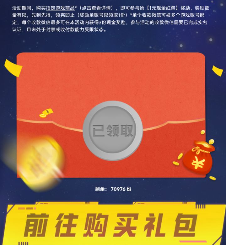 步骤①VX关注【游戏精选活动】,进入公众号右下角惊喜免单】—【一元现金红包】②点击下方【前往购买礼包】图二③购买图三礼包,继续回到图二领红包注意事项:⭐一定要先看红包余额,目前还有七万多份!,三款游戏都可以单独买一次领一次。⭐安卓用户可以用Q币支付⭐QQ区有号也可以买,钱会发到微信,号多的冲!#今天游戏圈发生了啥 #休闲游戏 #元梦之星 #动态创作激励计划 #发现好游戏 #游戏攻略