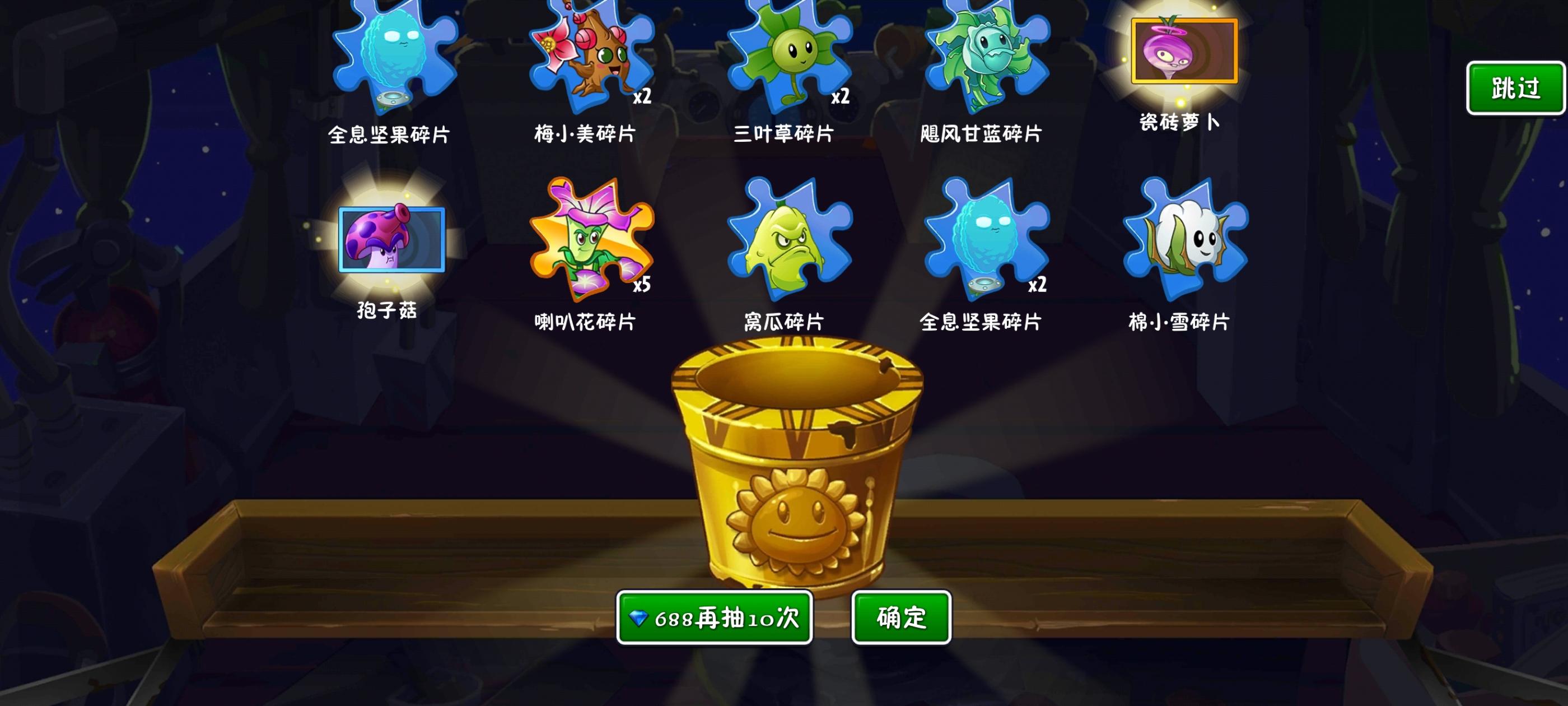 想着抽个688碰碰运气,没想到还真出了五片瓷砖。加上很久以前同样是688出的五片瓷砖,正好把瓷砖萝卜解锁了玩了114514年pvz2的萌新,终于有瓷砖萝卜了,真的太不容易了所以,当你只抽到五片瓷砖的时候,不要生气,也不要抱怨,等你下次又抽到五片瓷砖的时候,就有瓷砖萝卜了,加油各位小伙伴们快来吸欧气!#植物大战僵尸2 #游戏种草计划 #