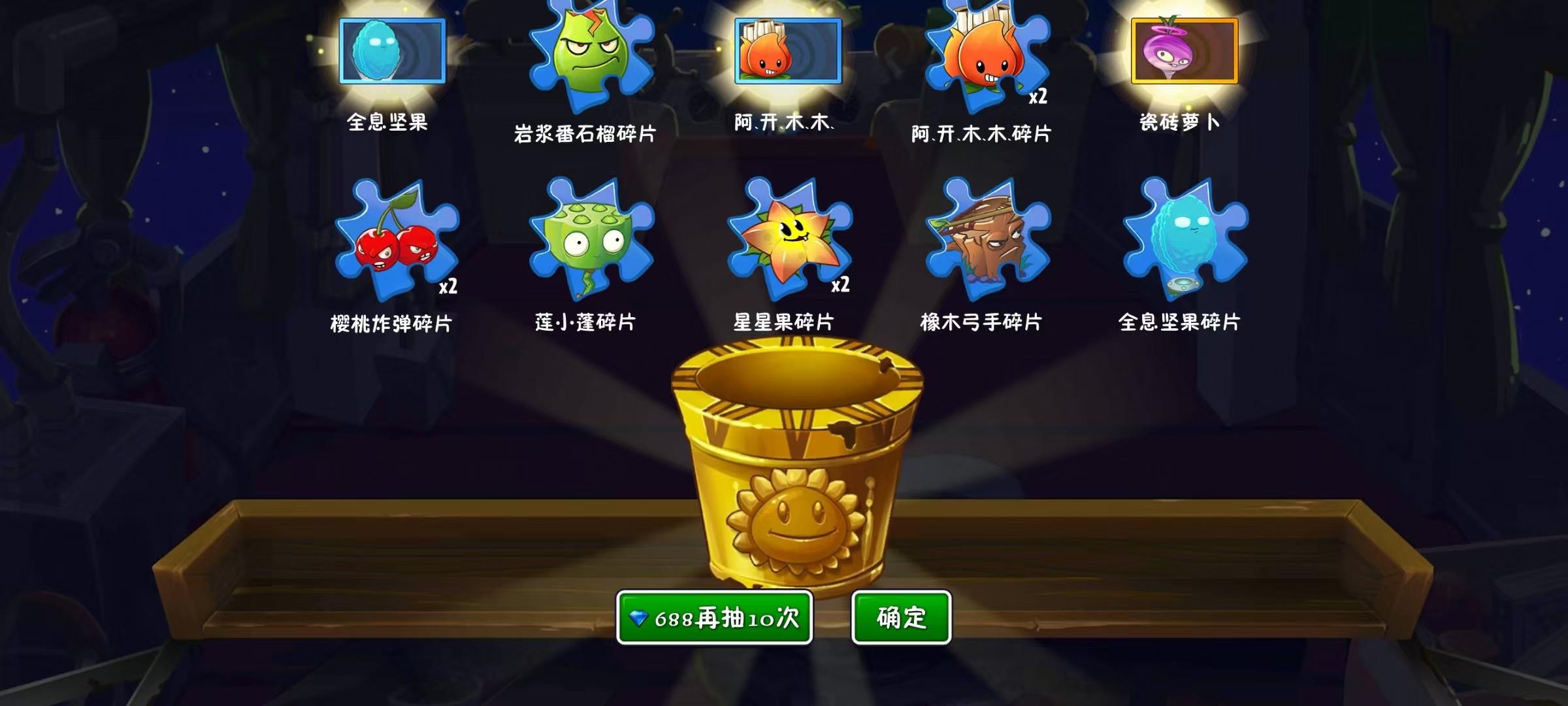 想着抽个688碰碰运气,没想到还真出了五片瓷砖。加上很久以前同样是688出的五片瓷砖,正好把瓷砖萝卜解锁了[表情_酷] 玩了114514年pvz2的萌新,终于有瓷砖萝卜了,真的太不容易了[表情_泪目] 所以,当你只抽到五片瓷砖的时候,不要生气,也不要抱怨,等你下次又抽到五片瓷砖的时候,就有瓷砖萝卜了,加油[表情_斜眼笑] 各位小伙伴们快来吸欧气![表情_开心] #植物大战僵尸2 #游戏种草计划 #