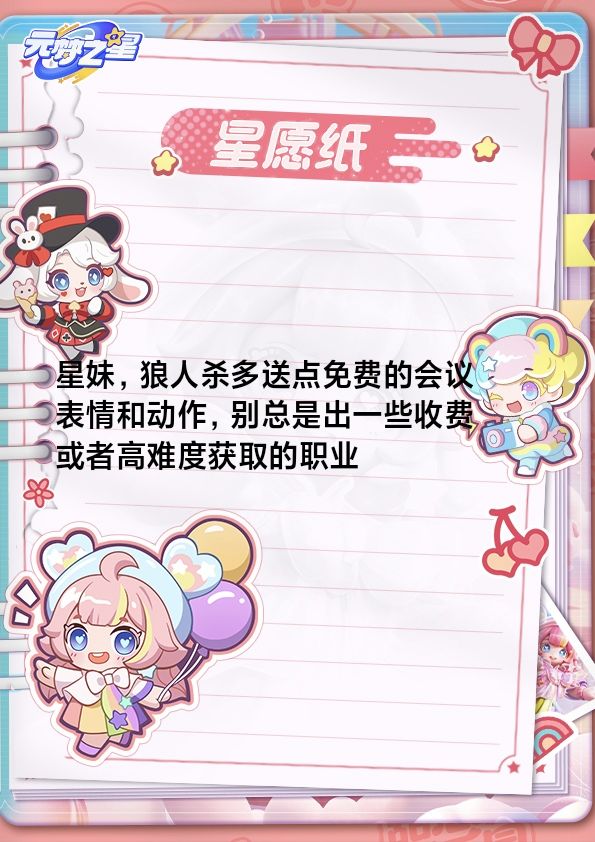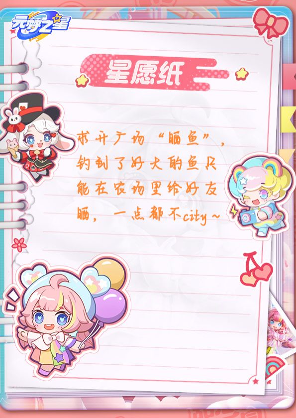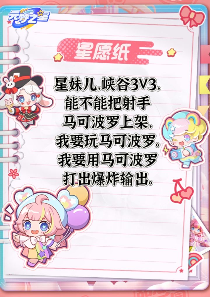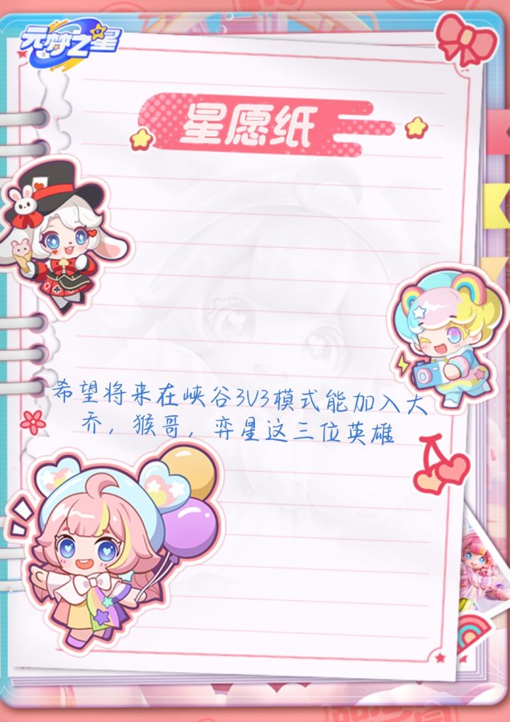 前方星宝请注意,“星愿池”福利甜蜜来袭!!!Tell 星妹你的赛季愿望是!什!么!是“MOBA玩法增加XX英雄?”,还是“增加XX作为农场装饰?”亦或是“XX模式增添新地图?” 不论是什么,只要在信纸上写下,带话题 发送,就有可能会成真哦~听说在星愿池中许愿还有机会获得随机掉落的惊喜奖励哦~活动时间:2024年7月22日至2024年8月25日23:59参与方式:活动期间,星宝们可以将