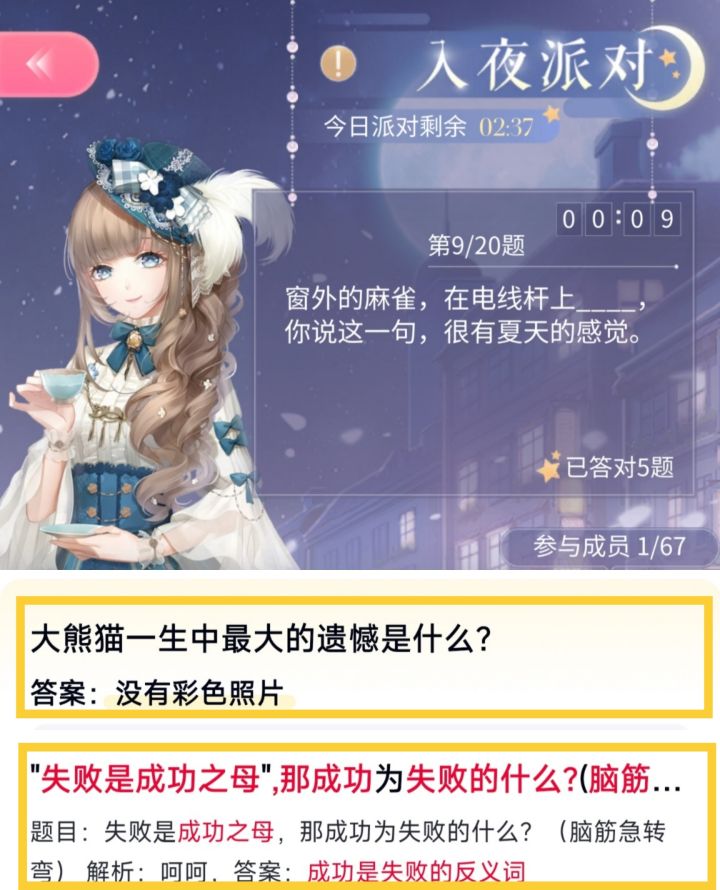 因为瞎用联盟币,都被我用来学那个妆容了(为了肝新手限时套装)。我特别缺贼缺联盟币,所以定了个闹钟做任务,结果我上线发现60多个人,只有我一个人在答题题目就是脑筋急转弯,歌词,暖暖设计师相关的大熊猫一生中最大的遗憾是什么?答案:没有彩色照片题目:失败是成功之母,那成功为失败#的什么?答案:成功是失败的反义词#甜甜的闪耀暖
