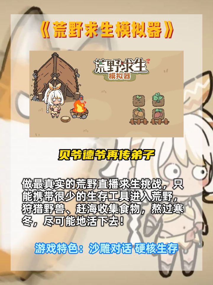 枯燥的生活需要一些调味品🧂,让我们看看这些生存类手游!🎮💡1.🎮《荒野求生模拟器》🎮:参加真人荒野求生直播节目📺,你能否通过自己的生存技能拿到全部奖金?💰2.🎮《庇护所》🏠:核平后的末日生存💣,如何延续家族是需要优先考虑的👨👩👧👦,希望大家都能在这个庇护所中活下去。🙏3.🎮《小生活-悠闲小镇物语》🏡:慢节奏小镇🏞️上的人到底是如何生活的?可能这才是大家最向往的日子。🌈💭4.🎮《生存之