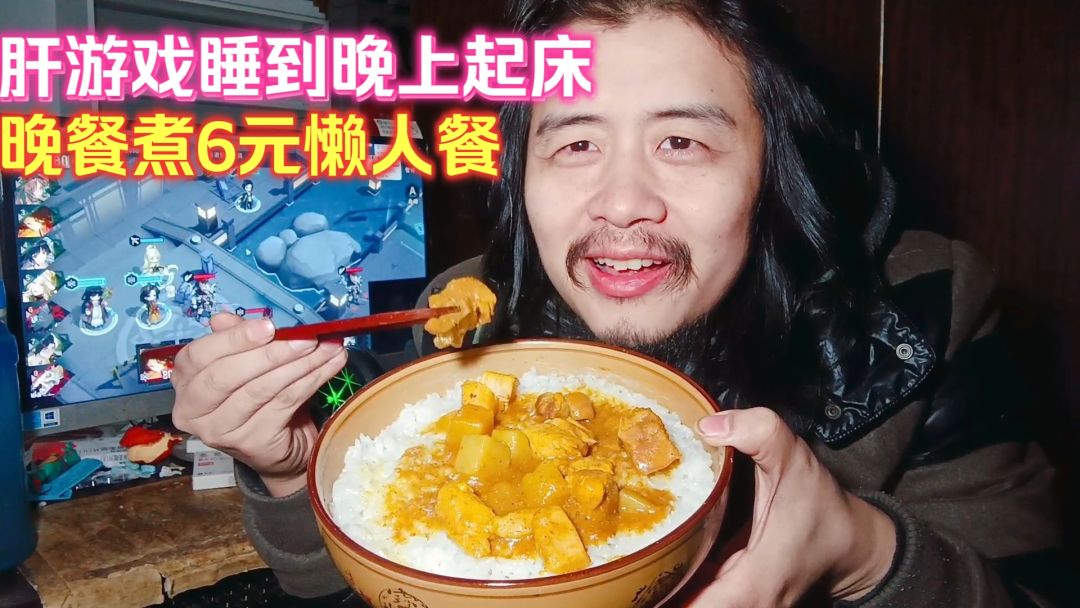 41岁宅男肝游戏睡到晚上起床,晚餐6元煮懒人餐吃,咖喱鸡肉米饭