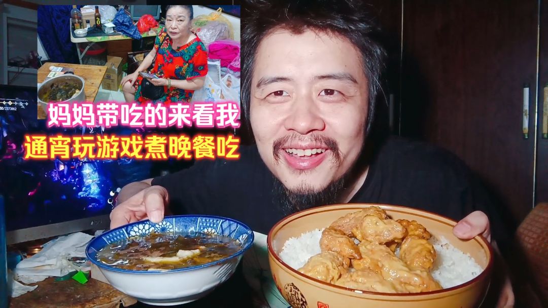 宅男独居生活通宵玩游戏,妈妈带吃的来看我,晚餐吃炸鸡肉海带饭