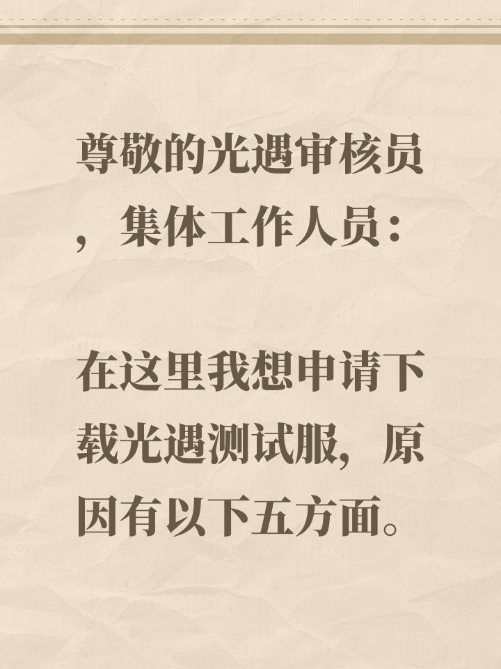 尊敬的光遇审核员,集体工作人员:在这里我想申请下载光遇测试服,原因主要有以下五个方面。1.在官服光遇体验了游戏,觉得非常好玩,交了许多好朋友, 也了解到了游戏交给我们的含义!2.想下体验服是因为想提前体验新的内容,会把一些建议积极投稿给官方!3.光遇的自由性很高, 画质非常精美,会把一些不完美的地方的建议提交给官方。4.本人也非常喜欢这款游戏,玩了也很久了,明白了这款游戏的魅力, 想发觉