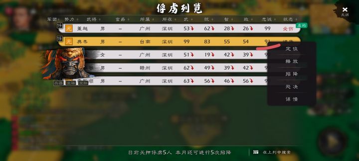 请问神典韦的忠义特性是不是绝对的?有没有可能流言他降低忠诚度,然后再派游说高的去游说成功?因为我自建武将有些带了义烈特性的,主动招降基本没成功过,但是关在监狱里时间久了突然有一天会就主动招降了。所以我意思神典韦也是有这个可能,能流言成功,再游说过来?还是说一定要俘虏他才行?#疑惑求解