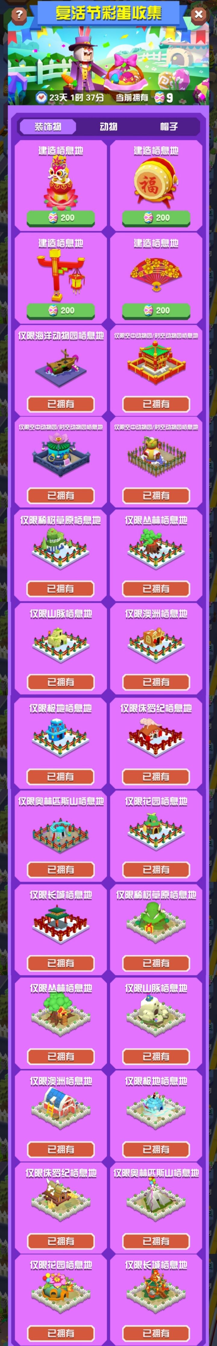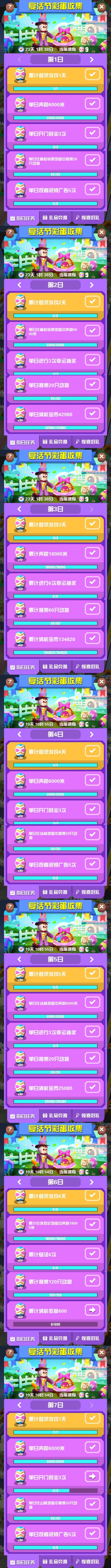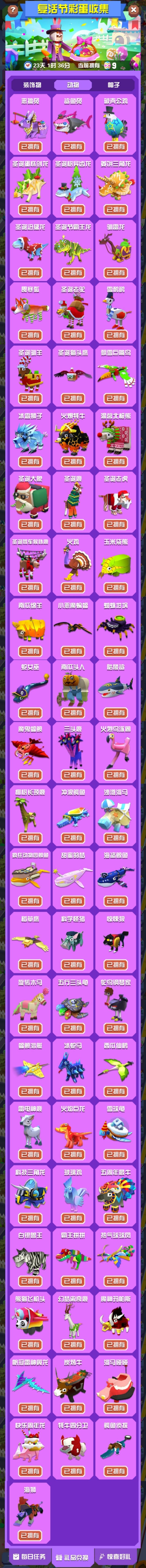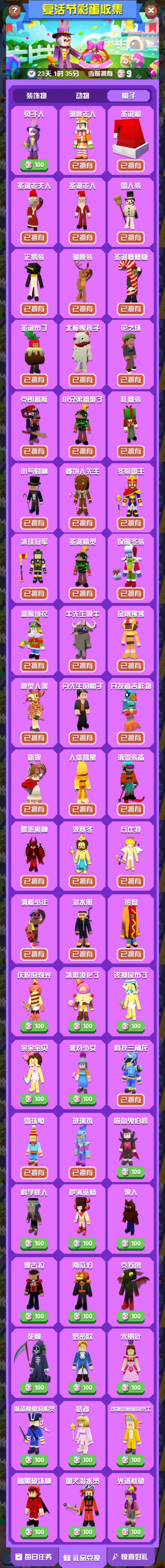 一、活动时间开始时间:2025年4月持续时间:25天二、收集兑换类活动 1.任意地图收集指定物品,收集到足够数量后可兑换活动装饰物、动物、帽子。 2.道具以类似宝箱形式随机在地图上出现,获取数量无上限。3.活动有每日任务(每日解锁5个任务,共计7日),完成任务可获取一定数量的活动道具(总计1030个),后续游戏天数可完成之前开放任务,见图二。(此条有误,待修改)三、动物1.新动物(