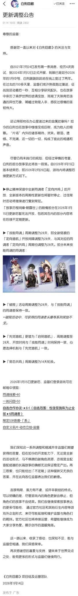#今天游戏圈发生了啥 #资讯评论员 #白荆 #白荆周年庆 #白荆回廊官宣停止周期性更新 2026年1月14日,就在迎来二周年庆典的第二天,《白荆回廊》项目组发布公告,宣布游戏将停止部分内容更新。这款由上海烛龙研发、腾讯发行的二次元游戏承认,当前开发能力已无法保证新内容的稳定产出,从2026年2月26日起,游戏将停止全新同调者的开放,全新版本的周期性更新也将暂停,原本预计1月15日上线的周年庆剧情