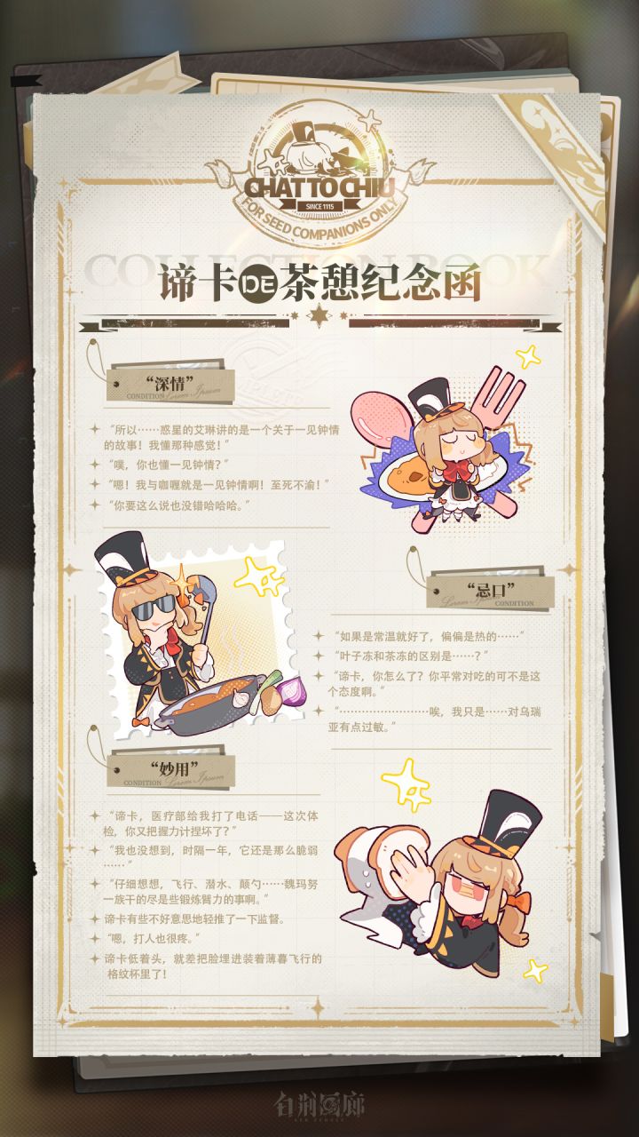「很高兴为您服务,我是谛卡,来自乌瑞亚的厨师。尊敬的客人,我听到您敲响点餐铃了。」#白荆回廊 #即食行乐 #白荆回廊谛卡