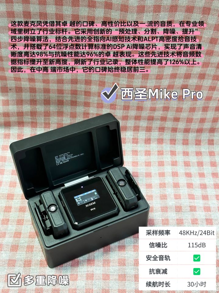 终于找到了我的本命无线麦克风——西圣Mike2!作为预算有限的视频爱好者,这次真的挖到宝了! 之前一直用手机直录,粉丝吐槽声音像从“诺基亚”传出来的,直到用了它,才知道什么叫开了“美颜”的声音! 我超爱的几个点: 💰百元价格,千元音质:采用了48kHz/24bit的高精准采样技术,声音细节还原得非常好,人声通透饱满,真的不像百元档的产品。 🎯智能降噪,收音干净:内置4重PSNE降噪算法,在