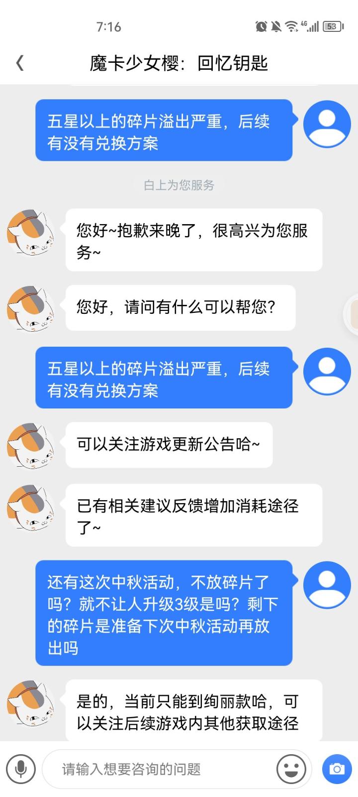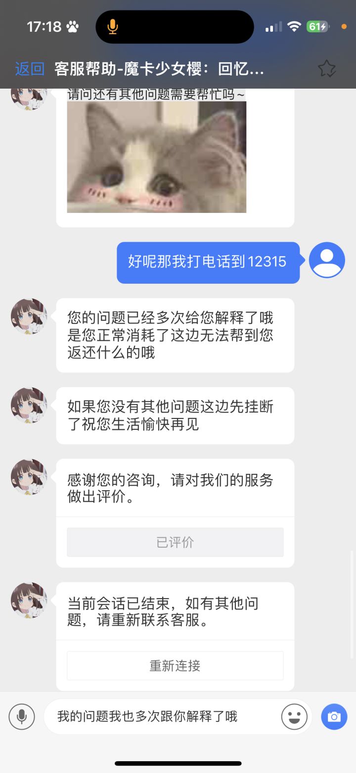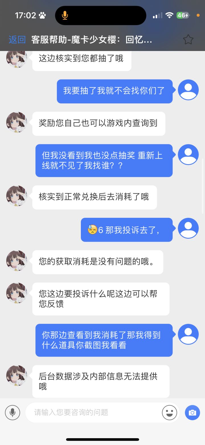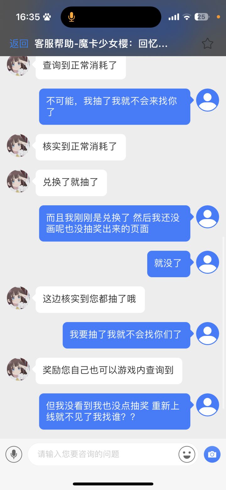 百变小樱是我从小就热爱的一个动漫,我也是一个很舍得为游戏花钱的人,但我不允许我花了钱也没开始抽奖东西就没了客服说我抽了 ,这游戏本身就有有时候卡着进度条一直不动的情况,我抽奖的页面还没点呢就显示我的高级盲盒券没了我肯定要去找客服,客服永远重复说我用了,然后很不耐烦的多次主动挂断我这个消费者想要咨询的事情,态度极其恶劣,想玩的心情都没了,#百变小樱