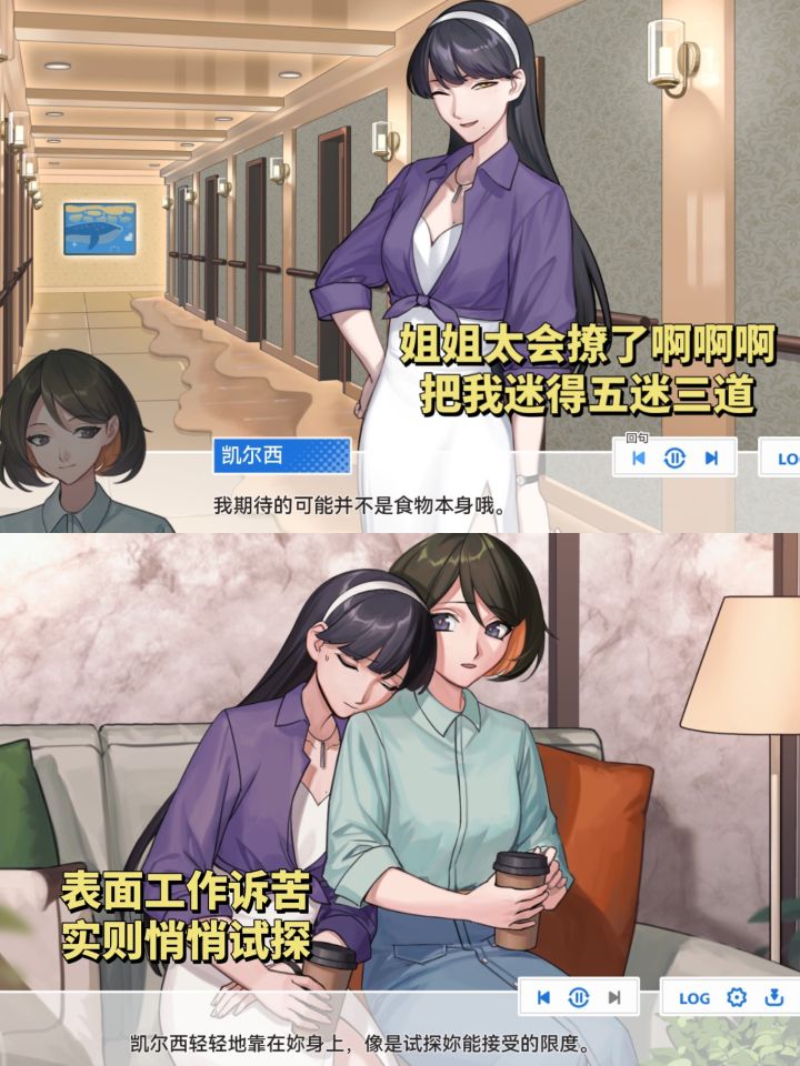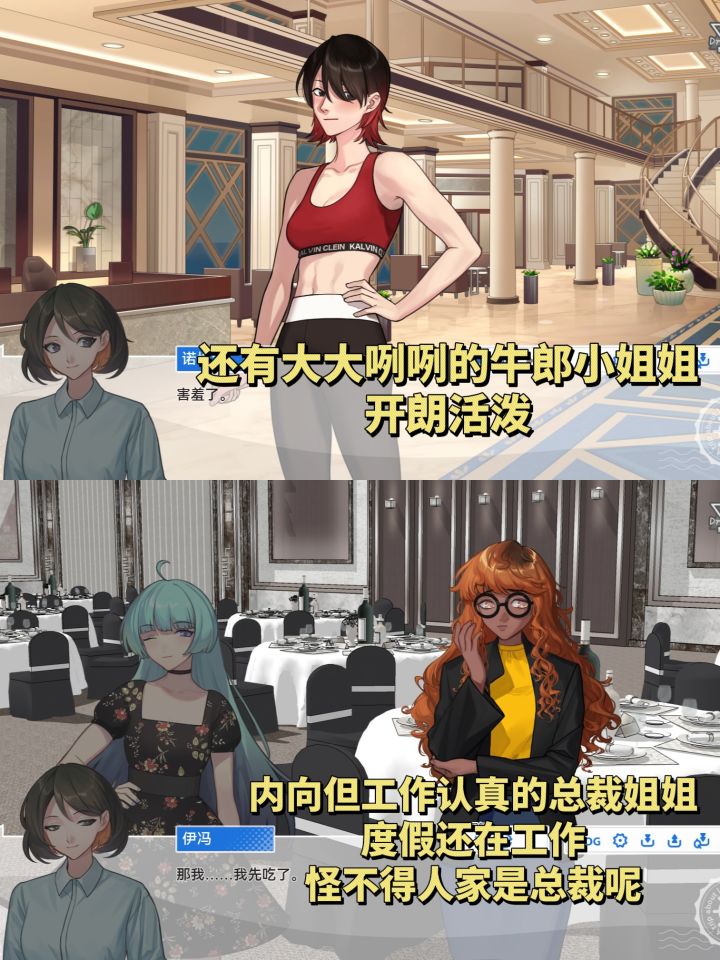 之前安利的「夏日远洋假期」出试玩版啦,于是本人速速玩了一下demo,给大家来个repo!玩下来的感受就是:成熟姐姐太有魅力了,迷得我五迷三道期待剧情:✨✨在百合游轮偶遇恋人✨✨剧情从主角的失恋登上百合游轮开始,偶遇了大学同学,游轮恋情就此开始!角色的对话都很成熟,会有各种关于工作、失恋的话题,还有各种现实中的梗,比如又贵分量又小的沙拉吐槽,要吵去外面吵的梗……属于会让人会心一