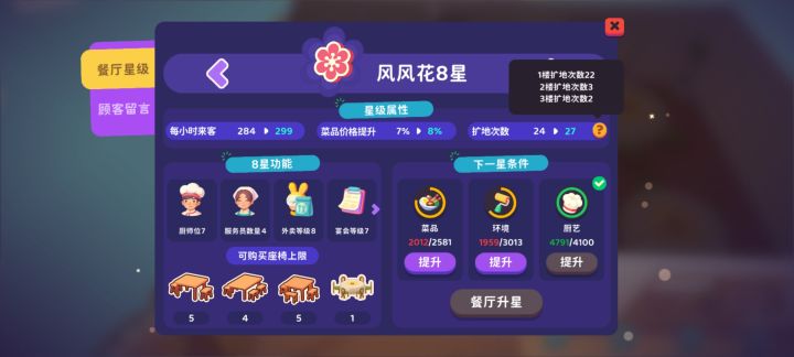 光升级到8星,我就发现了至少三个问题一、升到8星,1楼想要扩地时却发现不能扩,发现要升到9星才能扩,你不是在搞笑吗?图2不是显示1楼能扩22次吗?二、此时的我发现了一个没用的小设计,8星显示2楼能扩三次。但此时的我只有30级而开2楼需要70级。70级我要升到猴年马月,你这么早出现干什么?浪费次数吗?把这个次数挪到一楼不香吗?毕竟现阶段1楼才是最缺扩大次数三、我还怀疑8星功能那外卖等级和宴会等