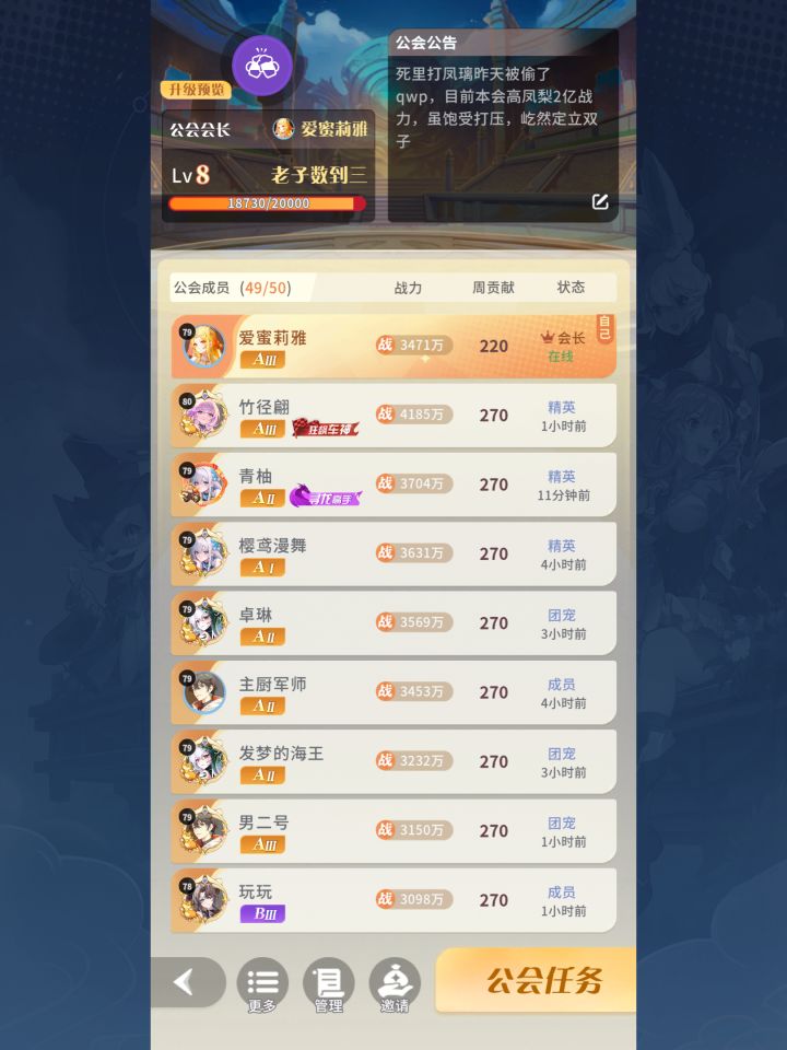小公会跃升经验加公会日常项处理完成技巧暗中观察 团长id:416201324 s264服公会,三周前接手公会的时候总战力仅四亿(阿巴阿巴没图,仅图一二周截图),目前实时战力十五亿(见图五,本会仅八级公会)稳定双子服第二。三周急速发展拷打本服榜一公会嗨嗨 靠后公会跃升提高攻略:灵魂出窍 首先再看图五图六,由二图可证明本人公会为后起公会,仅为八级,高原服榜一十级公会凤梨两亿(早上是两亿多,踢了个