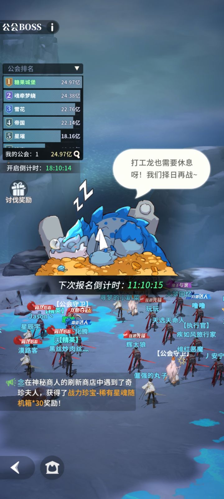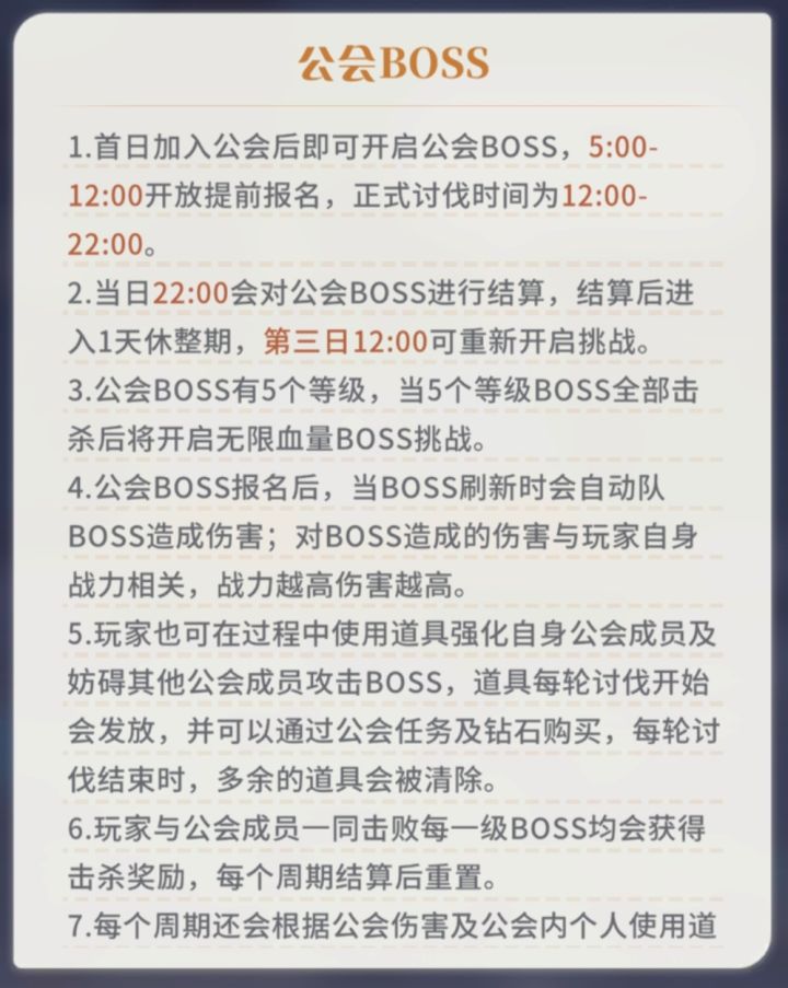根据提供的公会BOSS规则,以下是一些攻略建议:●1. 提前报名:在5:00-12:00之间进行提前报名,确保能够参与到公会BOSS战中。(一定别忘了报名,我有好几次就忘了)●2. 参与时间:正式讨伐时间是12:00-22:00,确保在这个时间段内参与战斗。(记得来参加,不然伤害太低分不到资源啊)●3. 休整期:22:00结算后,公会BOSS进入1天休整期