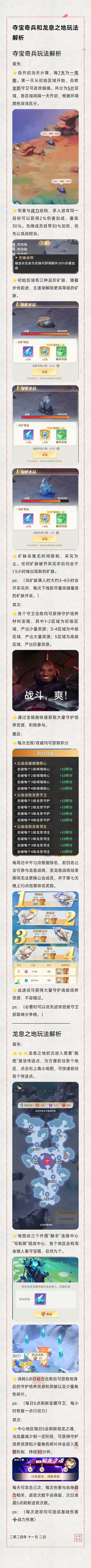 这次攻略所有的要点我都讲到了,整整做了一周时间到现在才几百播放量,真的崩溃了 ᴵˈᵐ ᵒᵏ(ᵕ̣̣̣̣̣ ͜ ᵕ̣̣̣̣̣ ˶ )♡ л̵ ——————————————————正文要点:⭐图一是整体思维导图⭐图四是更新后夺宝奇兵的玩法解析。⭐图五公会对决玩法解析虽然长,但都是精华。⭐图六龙息战场玩法解析一定要看,最容易遗漏资源的地方。最后:⭐开服一定要进第一活跃公会,如果名额满了可
