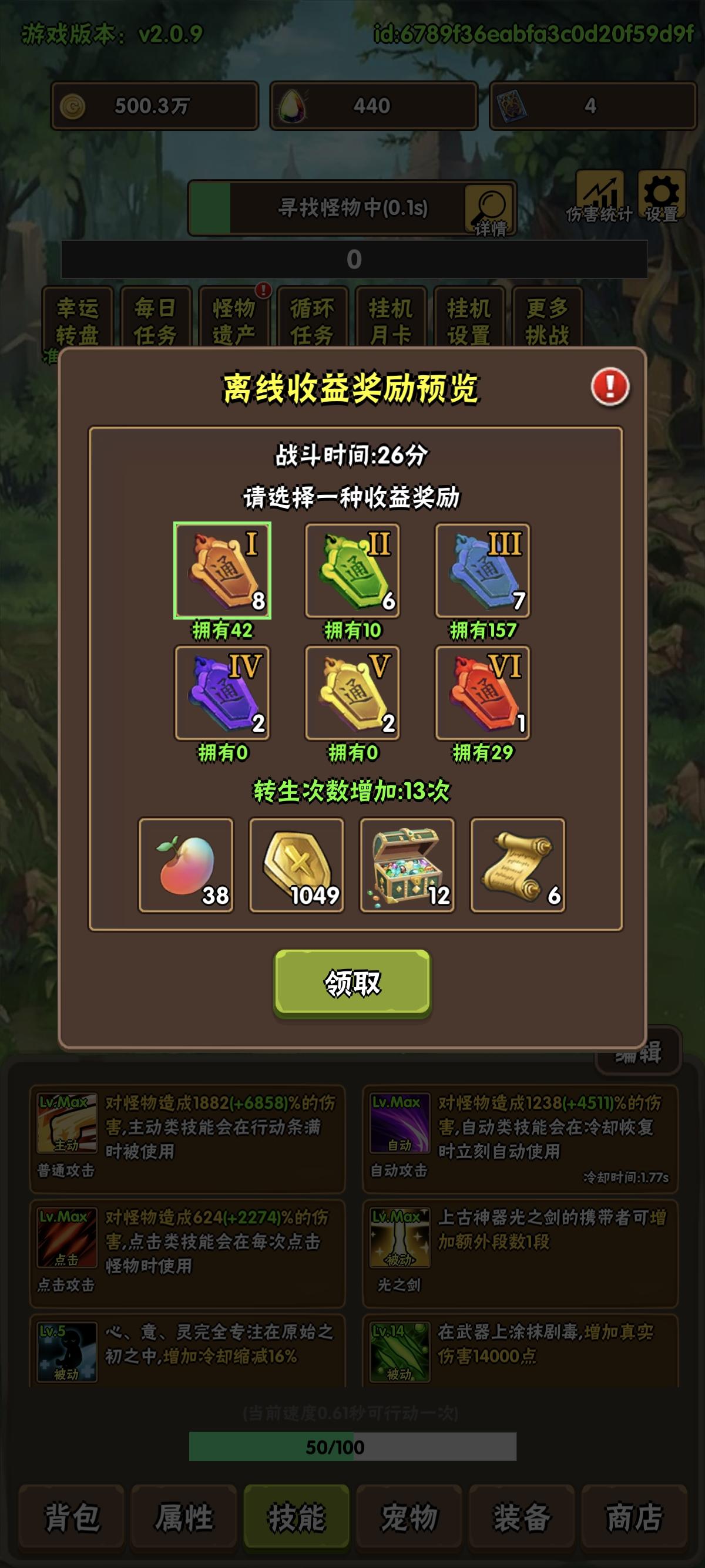 《不可能的》难度作为新手遇到的第一个大难点,推荐暂时先不打,每一层的怪物会额外提升‘免伤’属性,到后面血量防御很高,很难打,建议先提升属性,商店钻石永久限购内容都买了,技能等级都升满之后再打,幻化等级升到20,七天签到的宠物也能助力第一种低配置挂机靠属性刮痧过关这种方法适合刚解锁该难度想过关的新手玩家天赋把基础的怪物血量防御点满,金币加成尽量点高点击寻怪条然后选择关卡1一直挂机挂金币以及