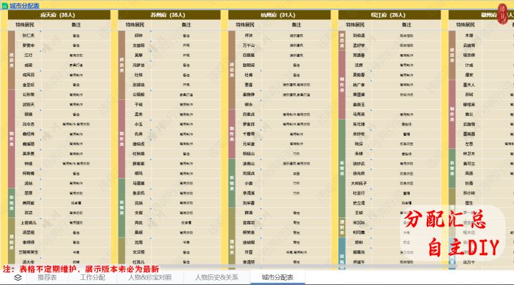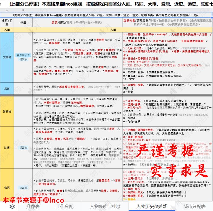 自由勾选 拥有角色城市分配 灵活选择梯度排行 一目了然严谨考据 实事求是三届传承 良工心苦由@H.Y创项,@玄玄精心维护的表格历久弥新。“人物&珍宝图鉴”分为五个板块:推荐表、工作分配、人物&珍宝对照、人物历史&关系、城市分配表。使用方式:点击右上角“三条横杠”,然后点击“生成副本”,即可自行DIY啦~(注:非常抱歉此功能暂未开放,个人希望表格能以更加完善的形态展现给大家,后续将开