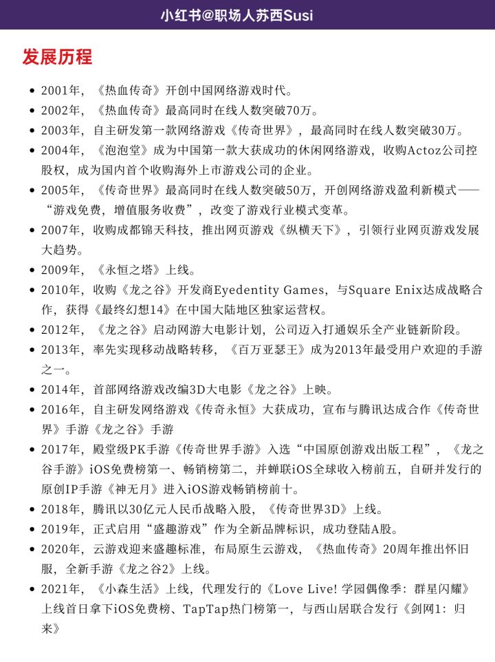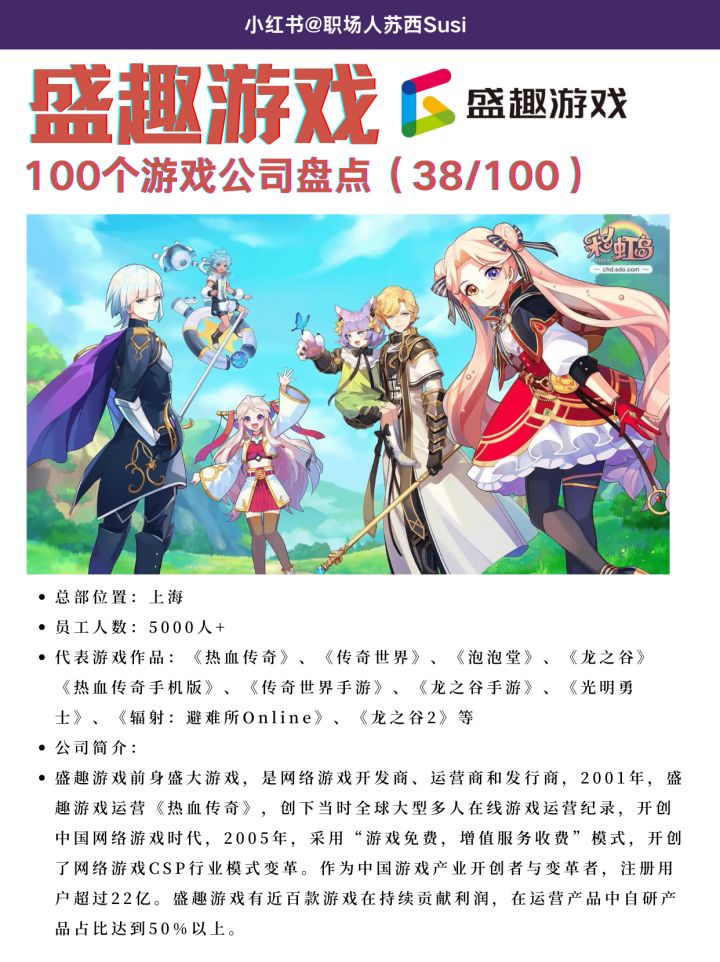 大家好我是游戏职场人JasonSu,受到邀请来taptap分享游戏综合知识、游戏营销和策划职场进阶知识,帮助希望可以从事游戏行业的小伙伴一起了解游戏~菜总部位置:上海菜员工人数:5000人左右菜代表游戏作品:《热血传奇》、《传奇世界》、《泡泡堂》、《龙之谷》《热血传奇手机版》、《传奇世界手游》、《龙之谷手游》、《光明勇士》、《辐射:避难所Online》、