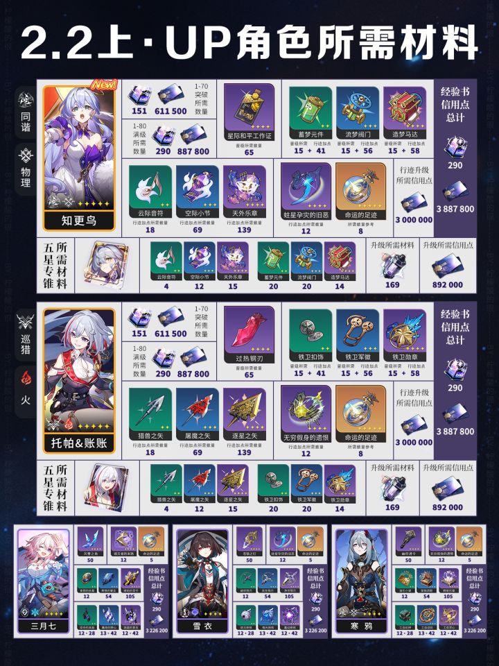 UID:1014786762.2up角色所需材料汇总2.2上半up角色:知更鸟+托帕+三月七+寒鸦+雪衣2.2下半up角色:波提欧+符玄+佩拉+卢卡+虎克后有全角色材料表#崩坏星穹铁道 #等醒来再哭泣 #知更鸟