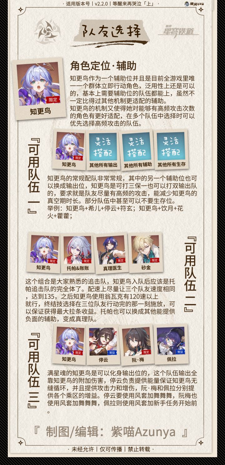 大家好!这里是紫喵Azunya!为了满足更多朋友的阅读需求,在新的版本我也给大家带来了全新的角色攻略一图流长图!内容包括:[行迹加点、星魂分析、光锥推荐、遗器推荐、词条选择、参考面板、队友选择]一共七项内容。接下来的日子里会把每一个角色的攻略以这样的形式传达给大家,当然全方位攻略系列也不会放弃,会同步更新,希望大家多多支持!#崩坏星穹铁道 #知更鸟 #等醒来再哭泣