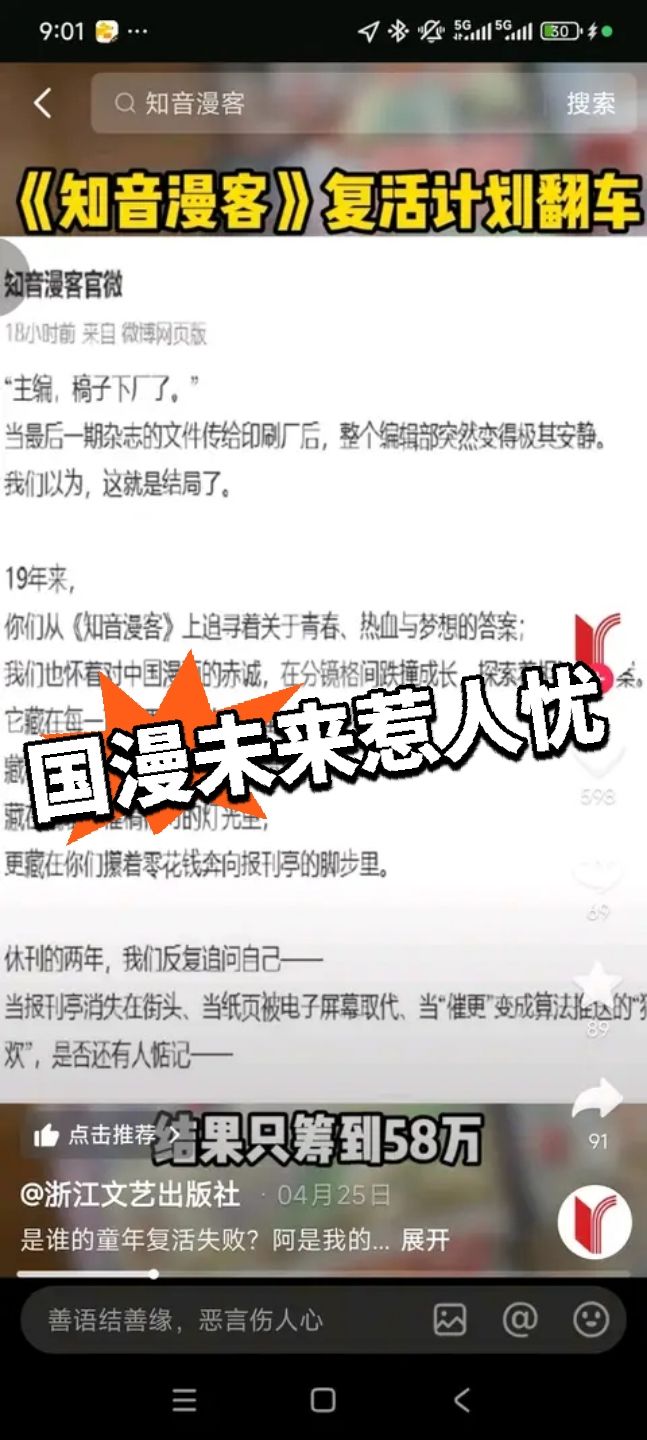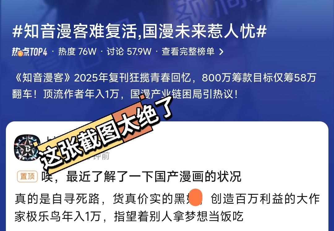 《知音漫客》又上热搜了。2025年复刊狂揽青春回忆,800万筹款目标仅筹58万翻车!顶流作者年入1万,国漫产业链困局引起网友热议。一个产业的顶流作者这个样子,咋可能指望崛起企鹅那边也削减相关开支,国漫未来确实堪忧。#生活杂谈 #acgn #二次元 #热点事件 #漫画 #知音漫客