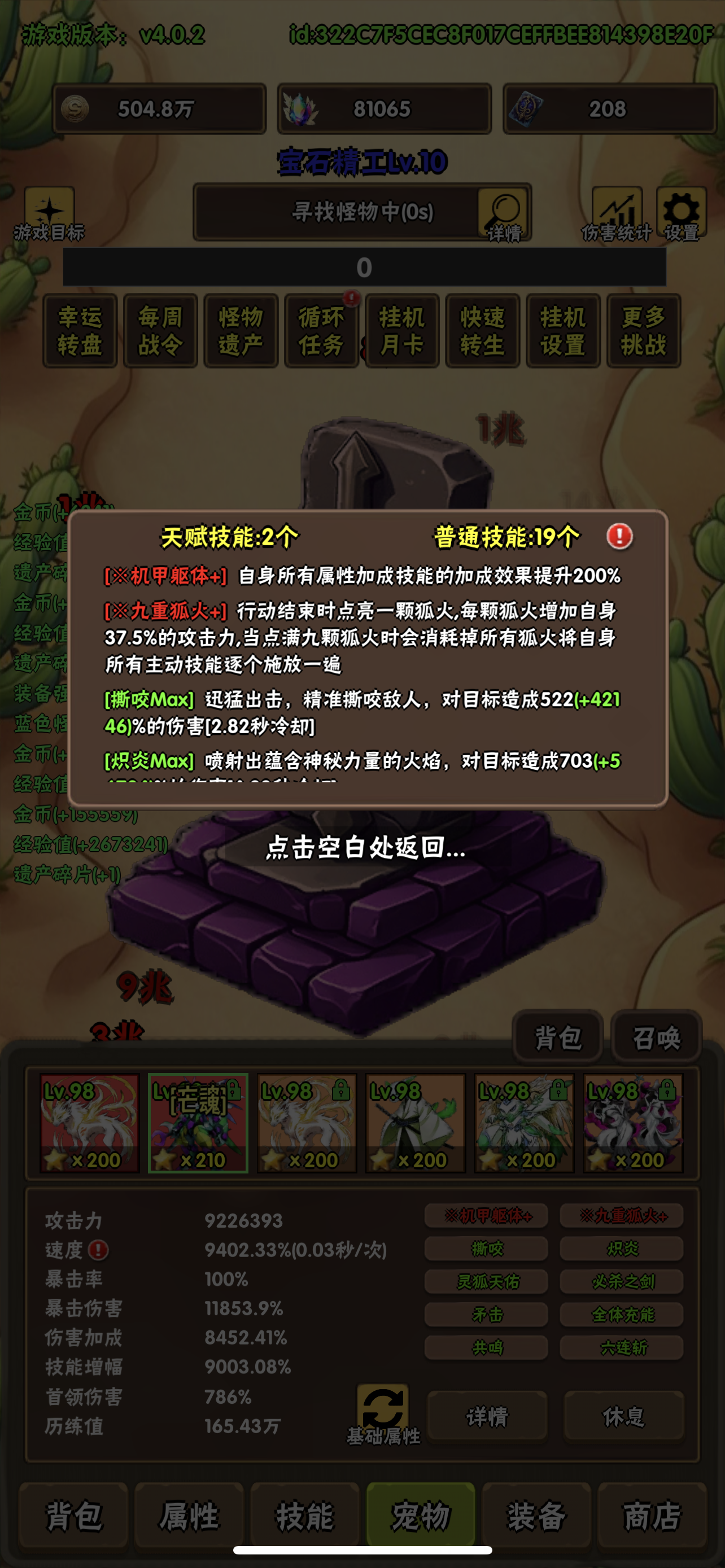 定制装备,不要cd 宝石橙8,加点552 非定制宠物,进阶撕咬,普攻80级,灵能50级 15w矿 其他没说的默认全满 操作:第一套减血进场秒切第二套(减防洞察光弓分裂穿心箭)最后一秒切第三套斩杀 总结:人物不重要输出也就相当于一只最高输出的宠物,差点配置可以用矿和技能进阶轻松补回来#破日开天 #破日开天宠物攻略 #破日开天攻略 #破日开天游戏 #破日开天福利 #破日开天更新
