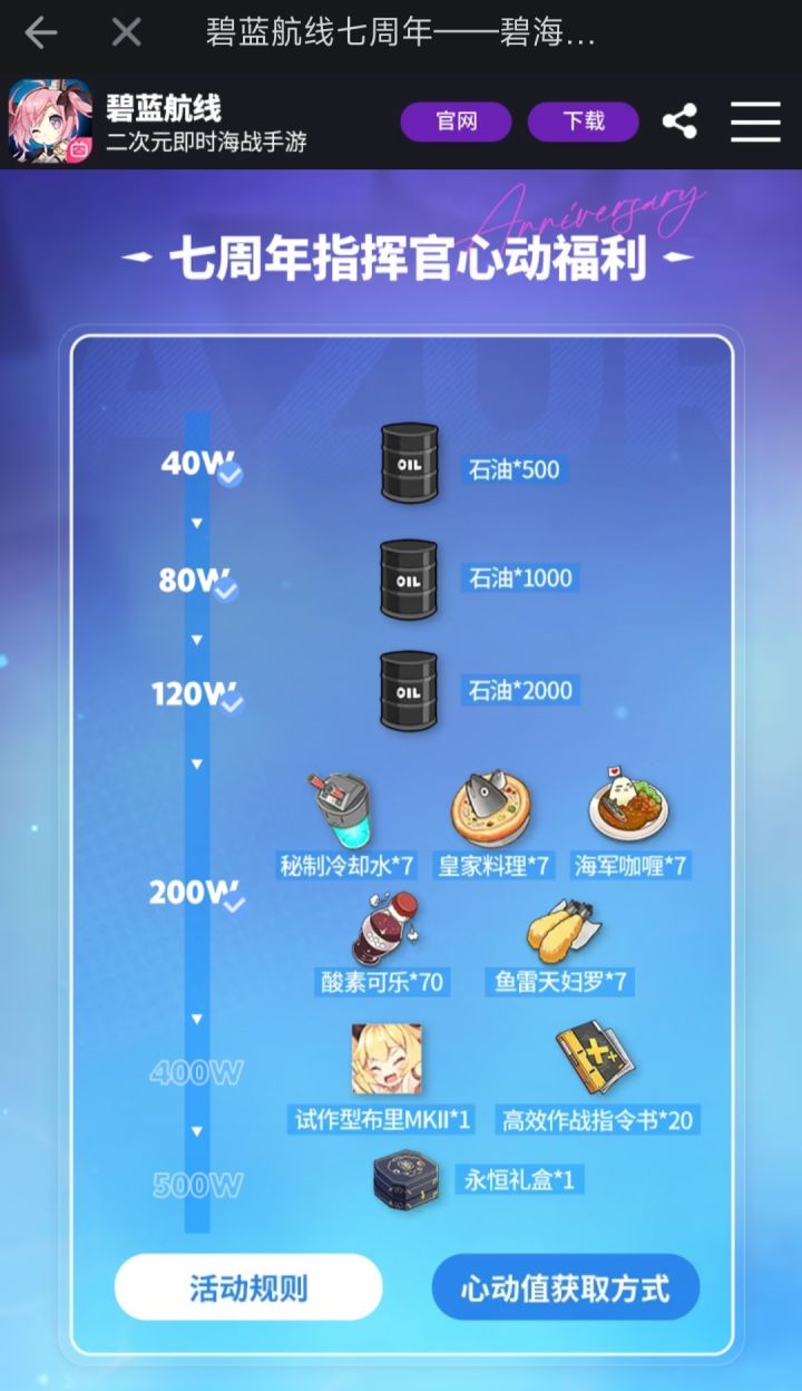 七周年已经开一周了,心动值还没突破400w。有空闲的指挥官帮帮砍一刀吧,孩子太想要免费戒指了#碧蓝航线7周年