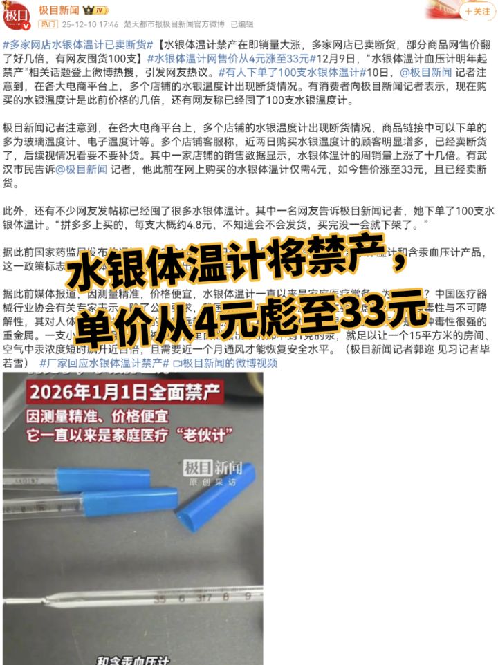 根据国家药监局最新规定,2026年1月1日起将全面禁止生产含汞体温计和血压计。此消息公布后,近期多个电商平台上的水银体温计销量出现显著上升,不少店铺已显示缺货,部分链接只能下单购买玻璃或电子温度计等替代产品。有消费者表示此前购买的水银体温计单价约为4元,目前相同产品价格已涨至33元且无法购买。个别用户甚至一次性下单了上百支水银体温计,下单后商品立刻就下架了。专家解释说禁产规定主要基于汞的强毒性