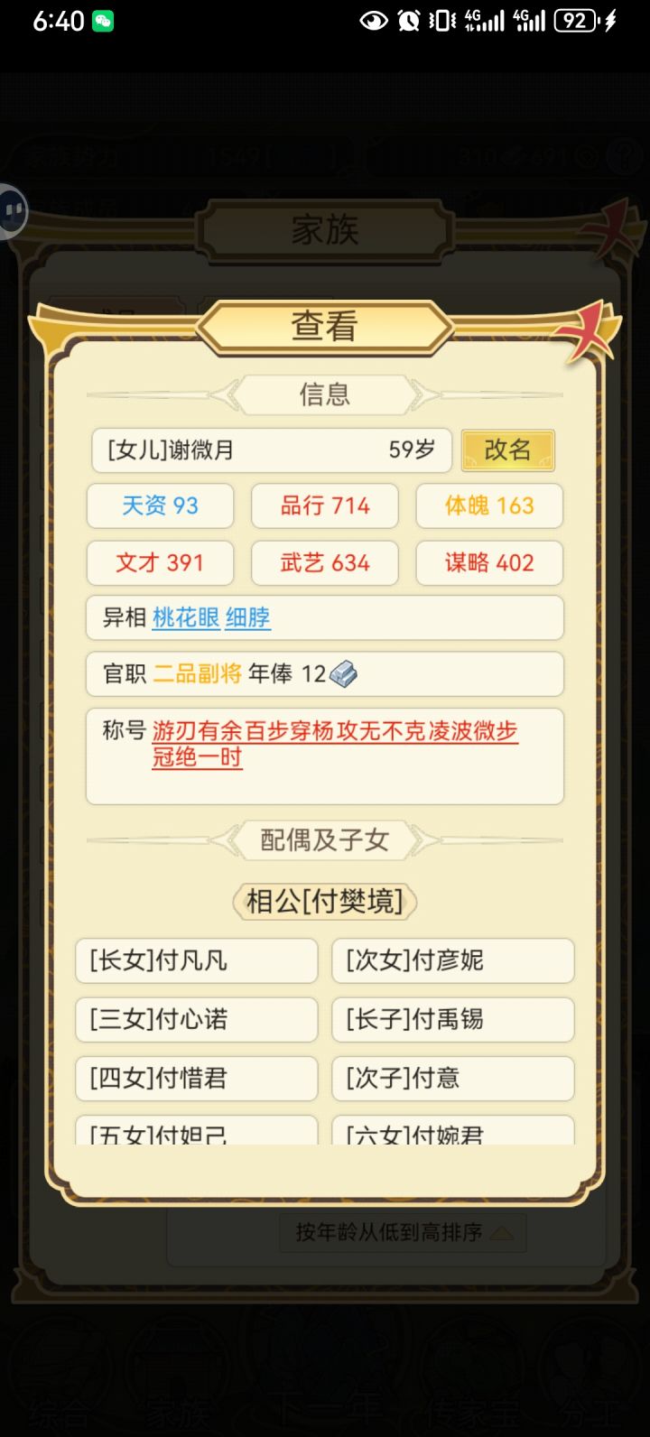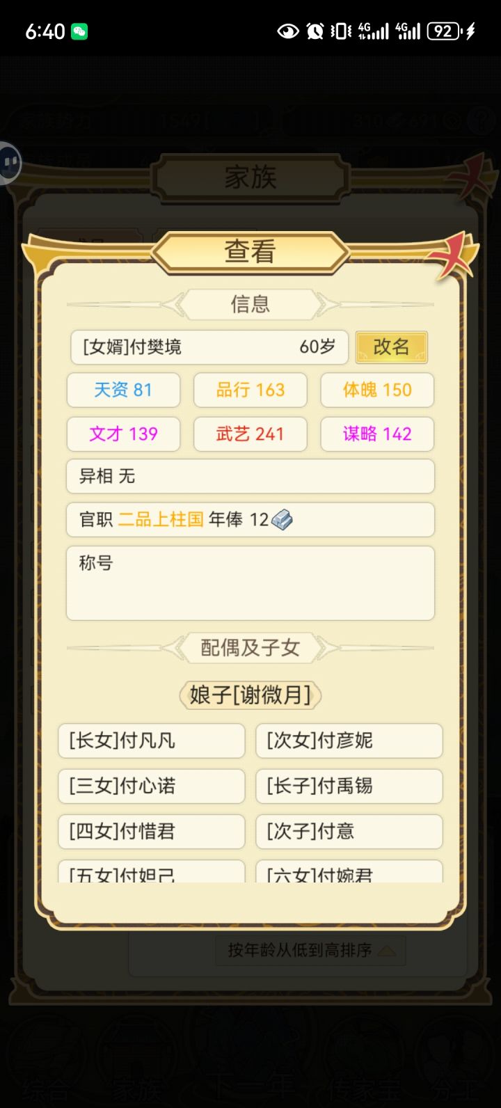 一个女儿,谢微月,天资不高,但基础属性高,但她真的,每次参加大会都取得头筹,称号拿到手软,次次升官,现在官至二品。还找了一个有出息的女婿,这个女婿是自己升官的我都没怎么管他,升官升的老快。还有个女儿,谢遮月,比她姐姐天资高,但取得的功名和属性没她姐姐高,每次大会都派她们姐妹两,每次都取得头筹,我老放心了。还有一个儿子,家里唯一一个文官,让他参加最好的比赛,次次垫底。还有一个好