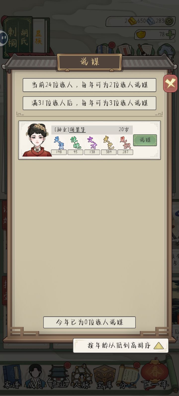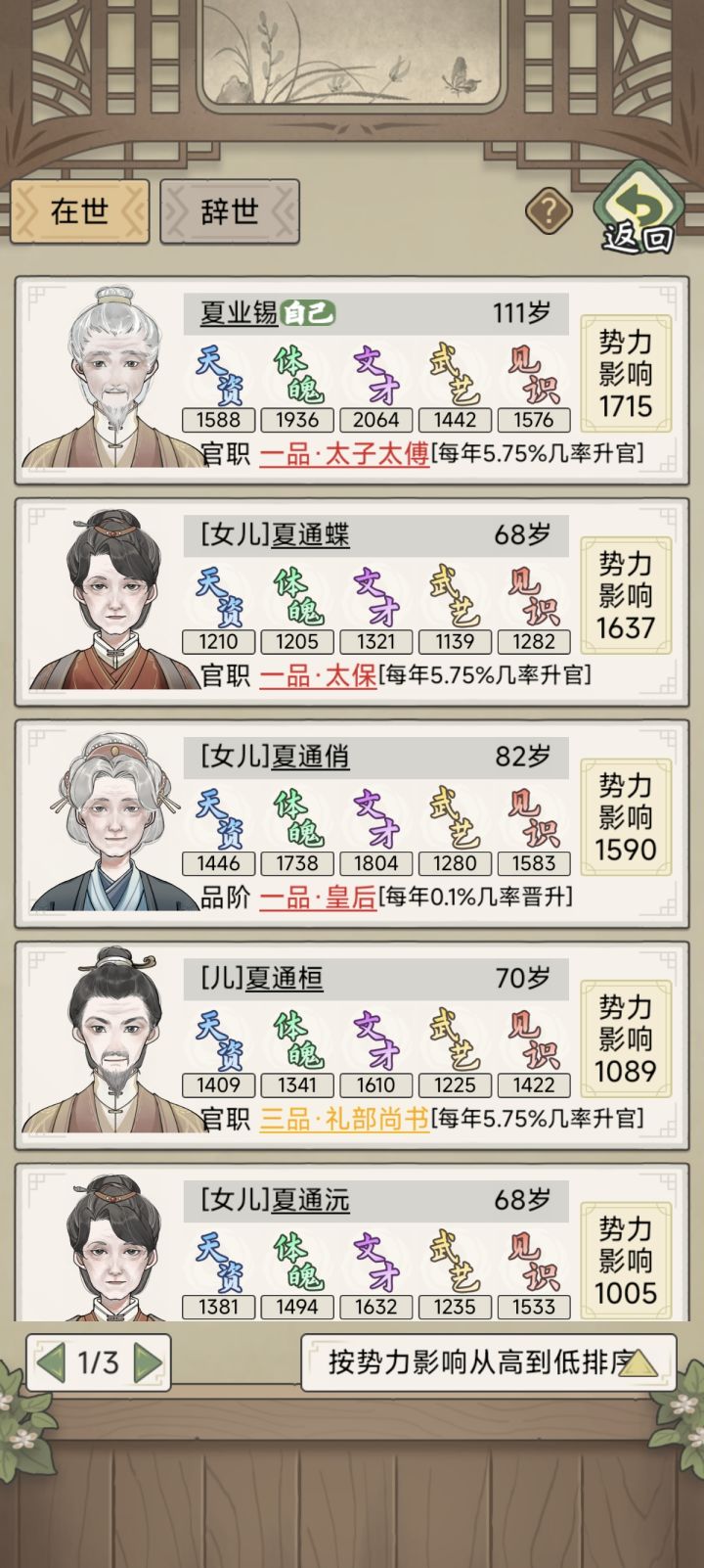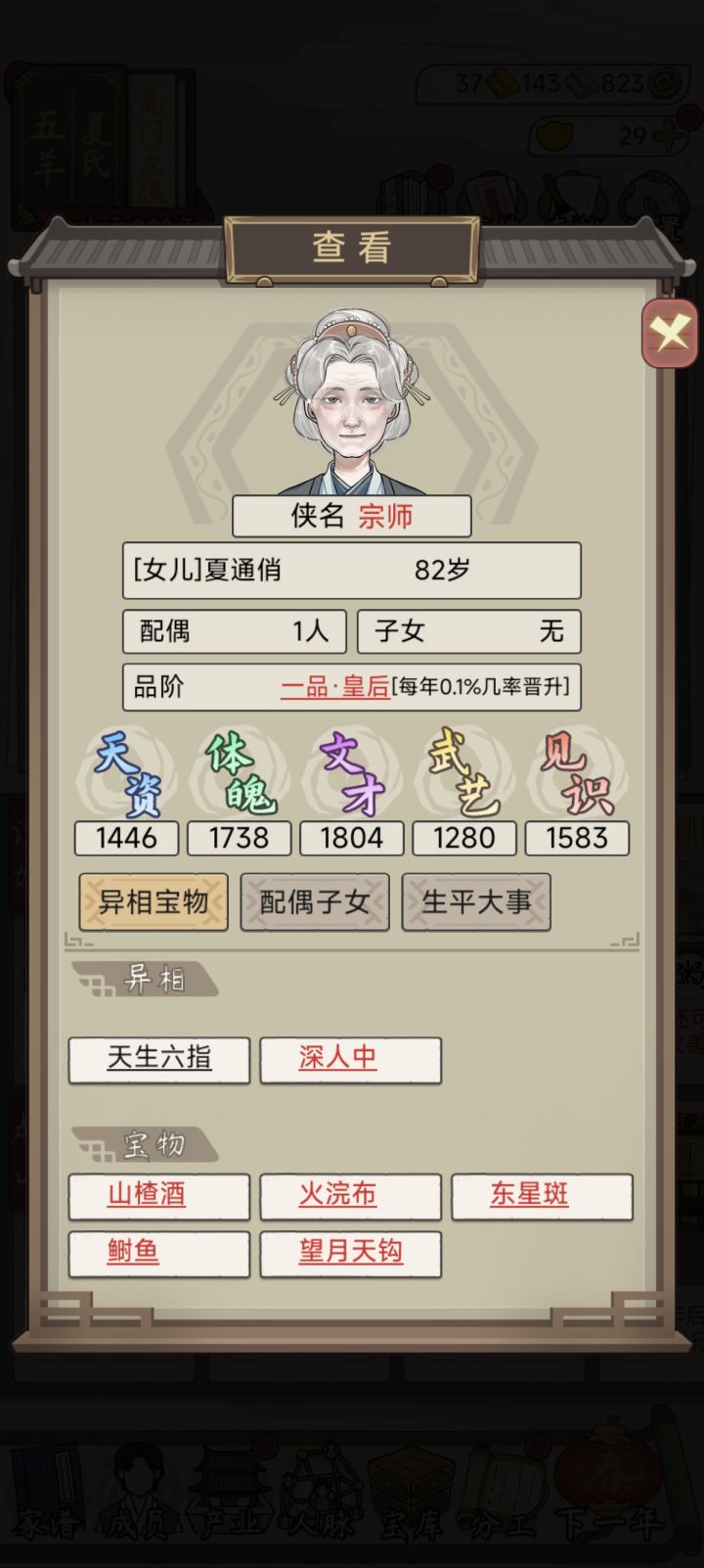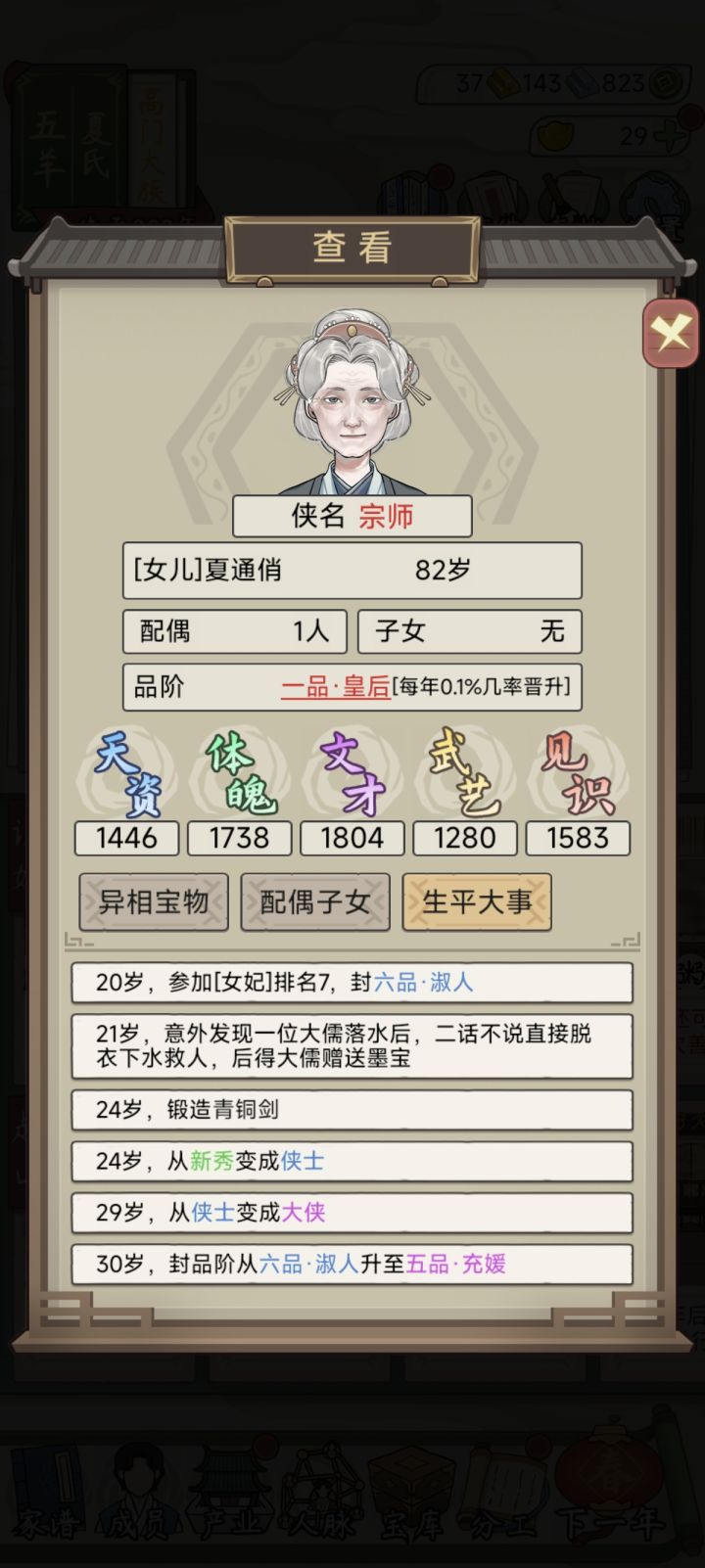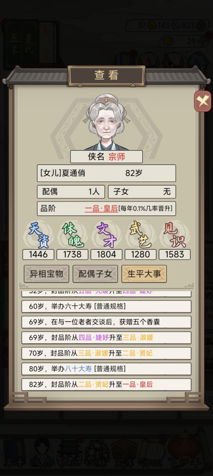 #祖宗模拟器传承 各种实验下,见识也好,天资之类的,都没啥用,感觉有点随缘单刷了好几次,后来还是选择了主存档,结果就出皇后了。50岁前当上的有点羡慕