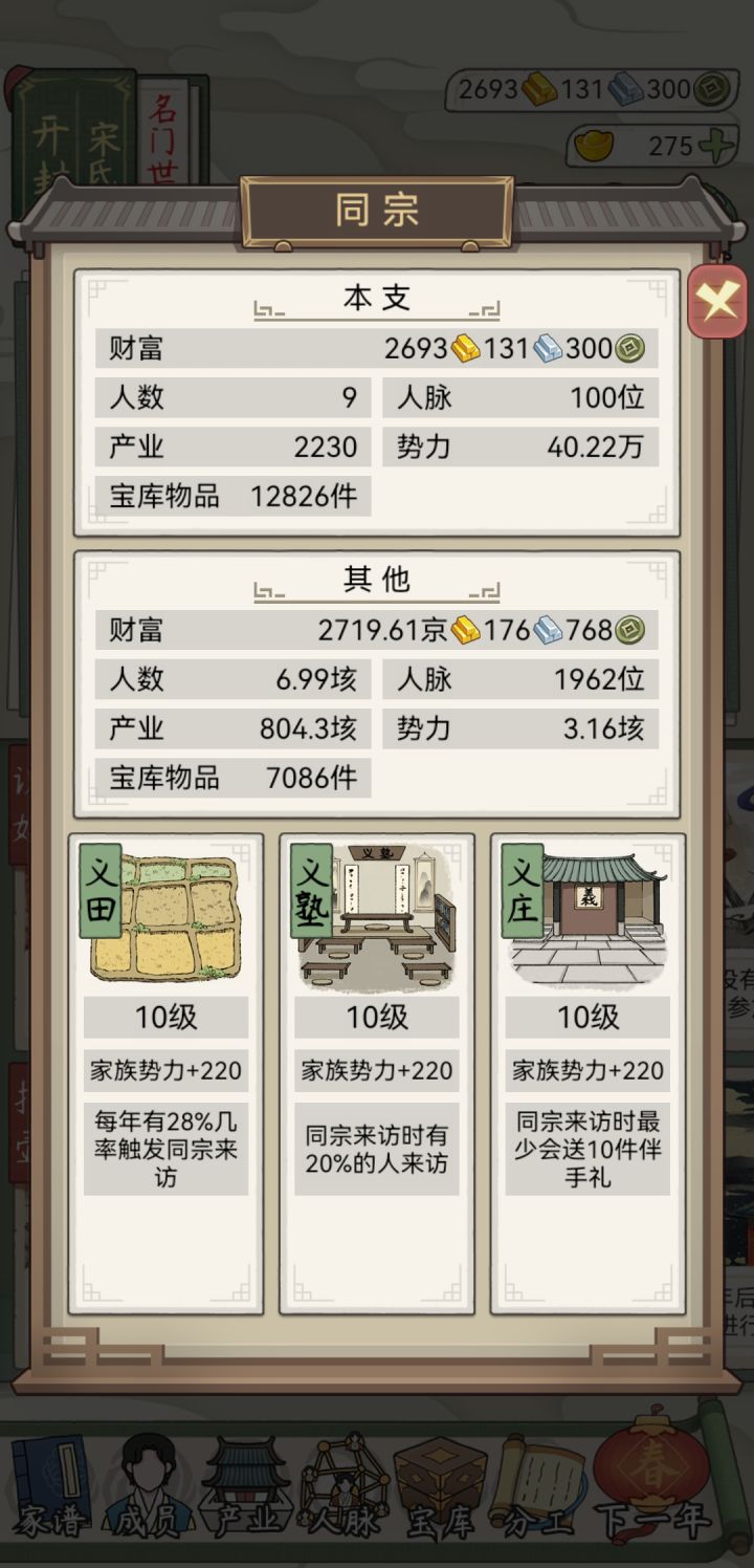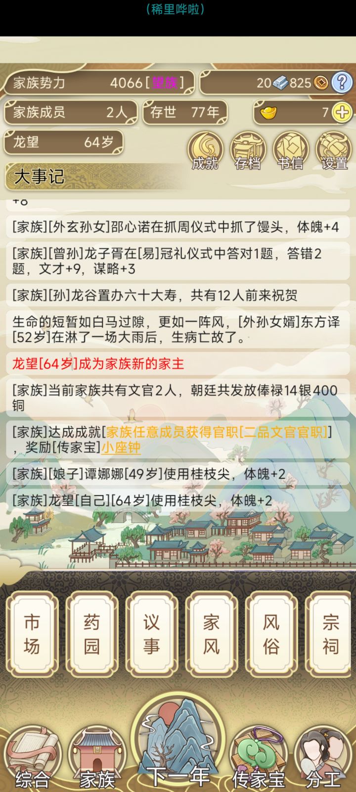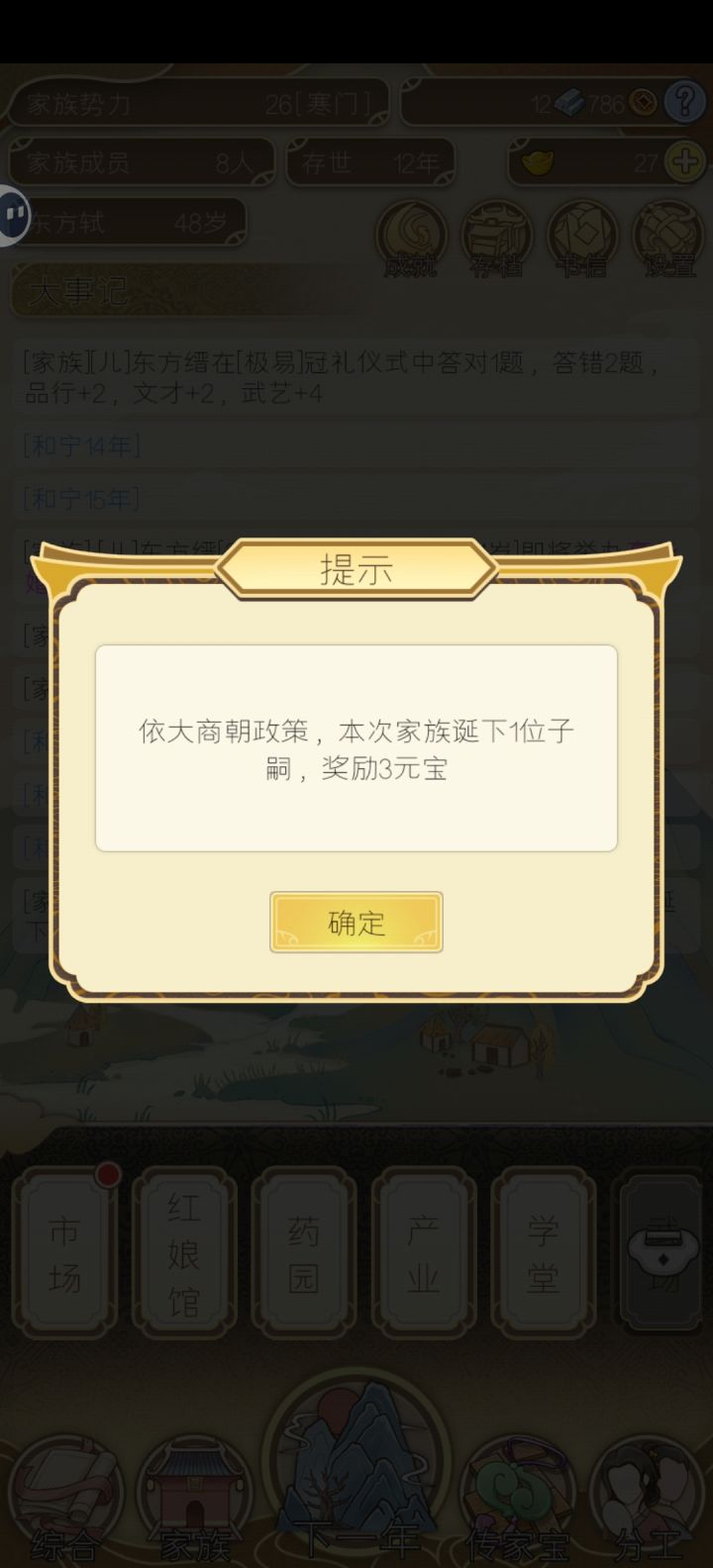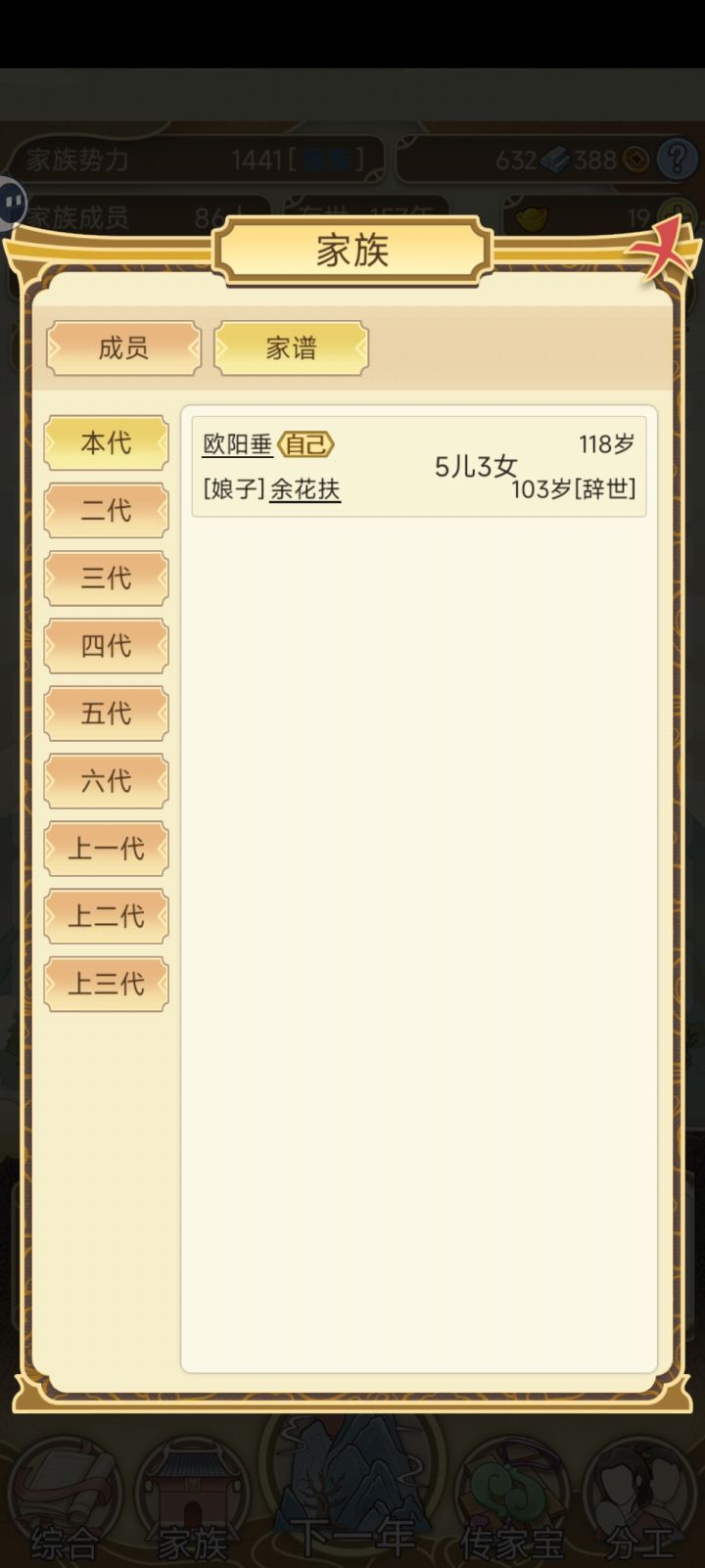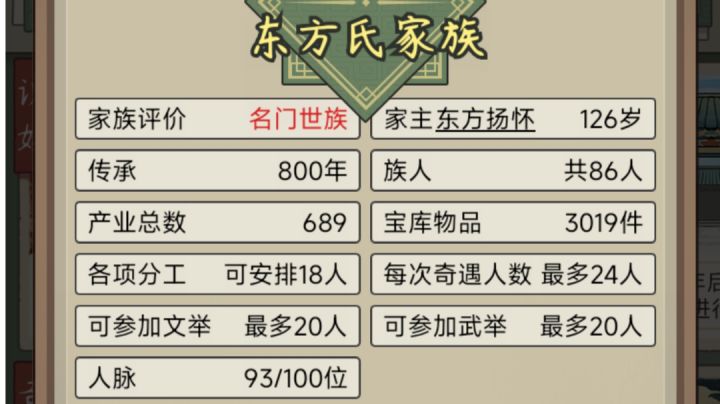 开局,要选鼓励生育,其余按自己喜好就行。个人以到达20万势力值,即为名门世族为结局目标,以9代为目标需要16岁为成年,而且算是很极限才能到达(就最高寿命下,并且刚到17岁生娃了。)正常800年应该可以到名门望族,正常21代家主【即字辈最后一位】一般110年左右就能达到显族,200年不到就是高门大族了。(主要还是元宝花销)平均下来每位家主有4位孩子,最多的孩子到8个,最少1个。玩法建议: