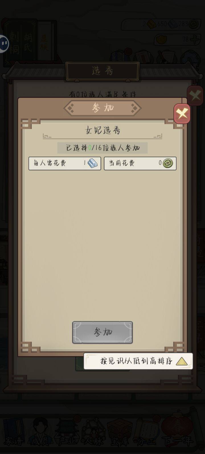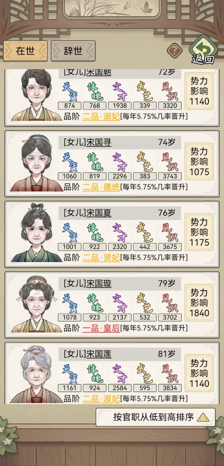 #祖宗模拟器传承 原本以为入宫也像文武官一样可以有多个相同的一品官,然后就突发奇想,如果同时存在几个皇后岂不是很搞笑,结果玩了2000年都没有,每次都只有一位皇后其他的就升不上去了。后来经过反复存档(有4个2品妃,显示概率5.75%)测试了100次,结果还是不能升级皇后,所以这应该是游戏的隐藏设定了~