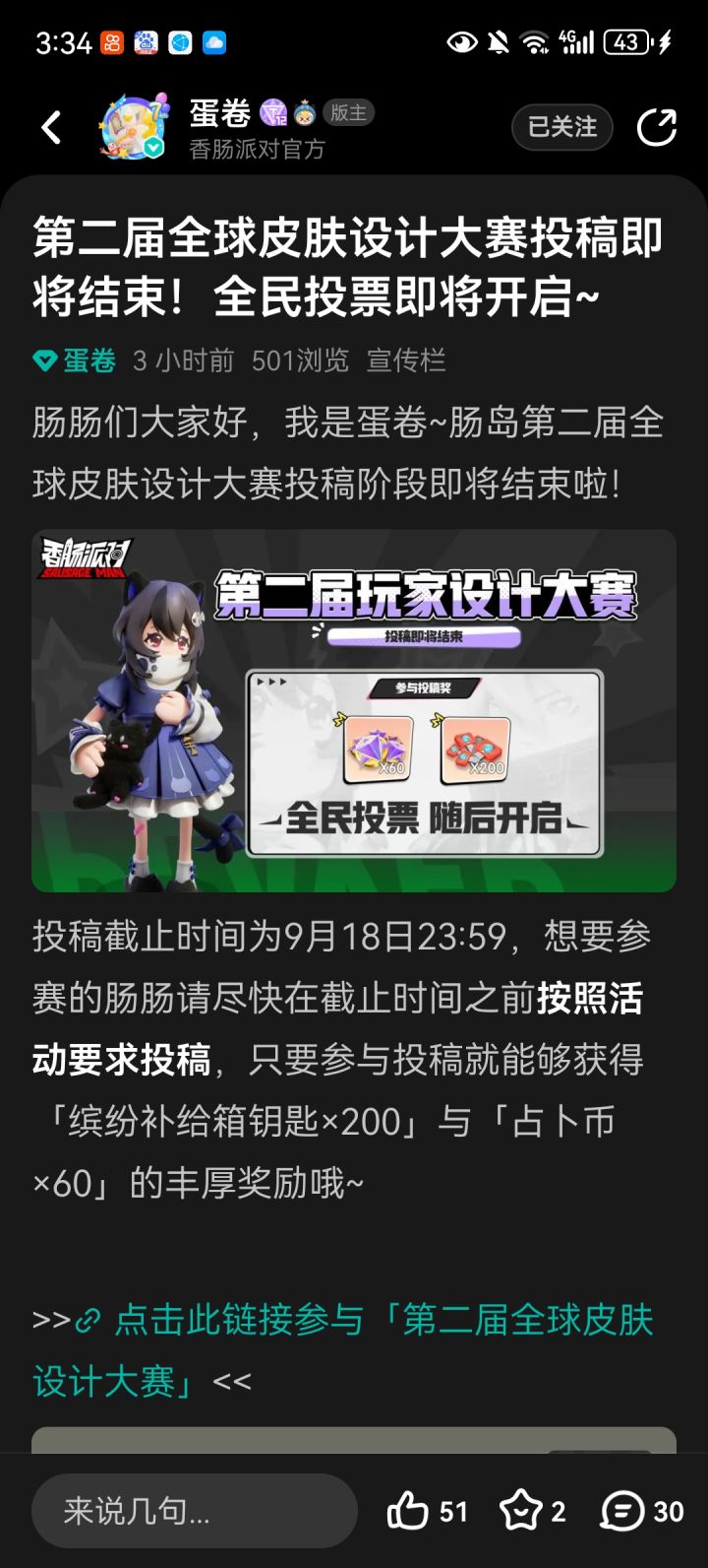 第二届设计大赛要结束了,马上就到投票时间了,这时候我的心情是非常激动紧张的,我等我设计的皮肤上已经是很久了,一直更新也是为了今天,我奋斗的梦想就是未来当个皮肤设计师,但因为环境不允许,所以我把自己的希望全给在了设计大赛上了,这样也许能让官方大大们看到吧,虽然是手绘的看起来粗糙了点…我经常更新也是为了实现梦想而努力吧…#游戏讨论#香肠派对#香肠派对第二届设计大赛#祝香肠派对官方越