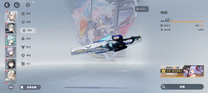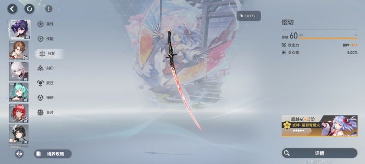 没专武,用的5阶通用武器樱切强度也还是可以的,作为新手首充送的角色,强度不用怀疑,用通用武器就有不错的输出能力。#深空之眼 #神威 #绯染樱切