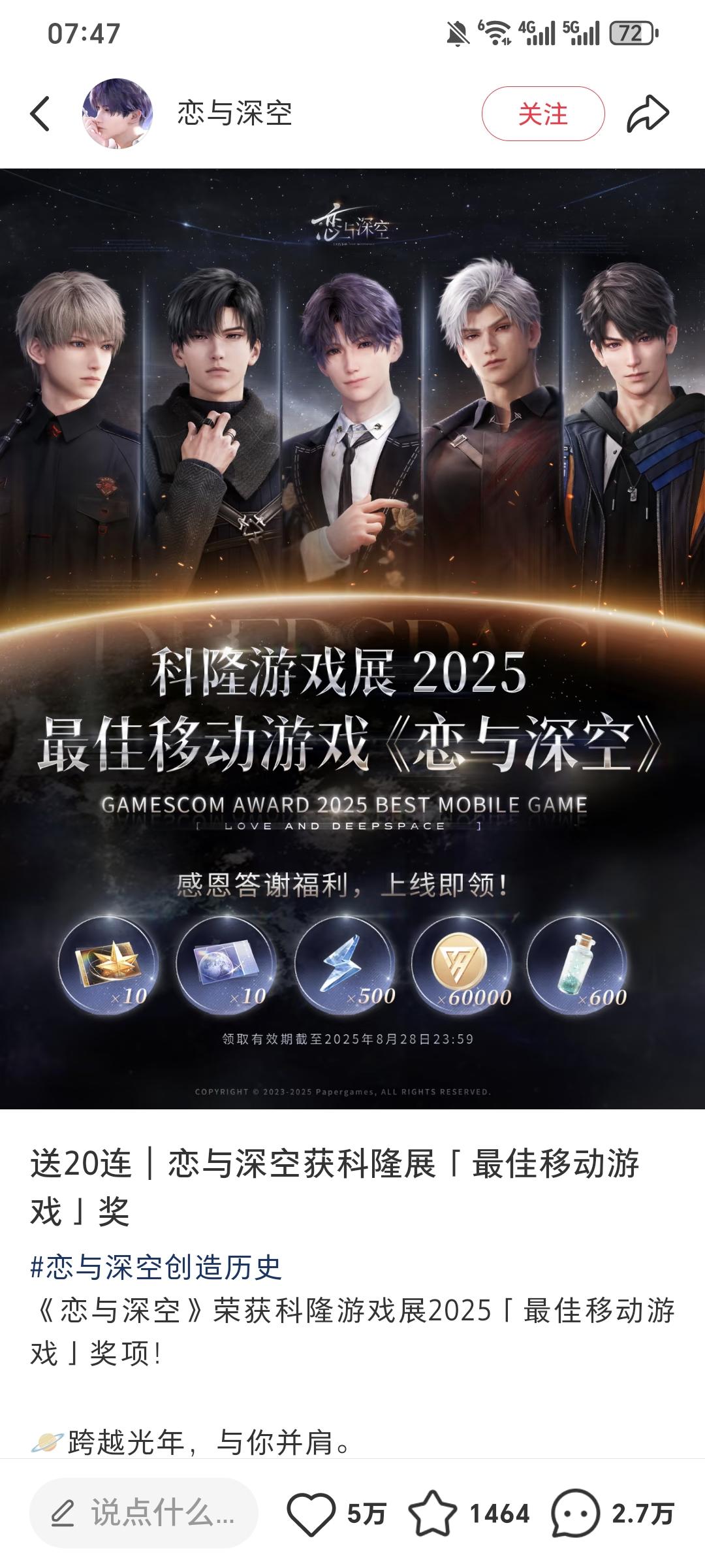 中国手游《恋与深空》获2025年科隆游戏展最佳移动游戏奖 北京时间8月22日在德国举行的2025科隆游戏展上,中国游戏公司叠纸开发的超现实3D沉浸恋爱互动手游《恋与深空》荣获“最佳移动游戏奖” ,成为首个获此大奖的女性向游戏作品,也是本届获奖的唯一中国游戏。 作为全球顶尖的电子娱乐展览会之一,科隆游戏展规模屡创新高,今年吸引了来自全球72个国家和地区的1500多家展商参展,其游戏大奖的竞争极为