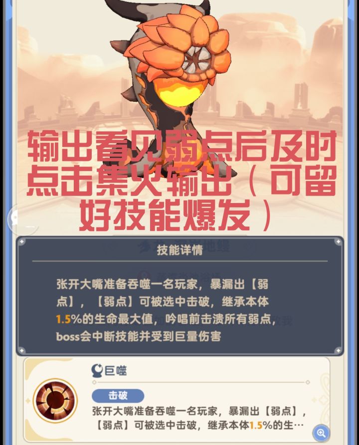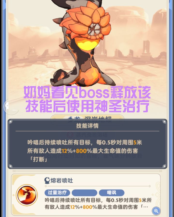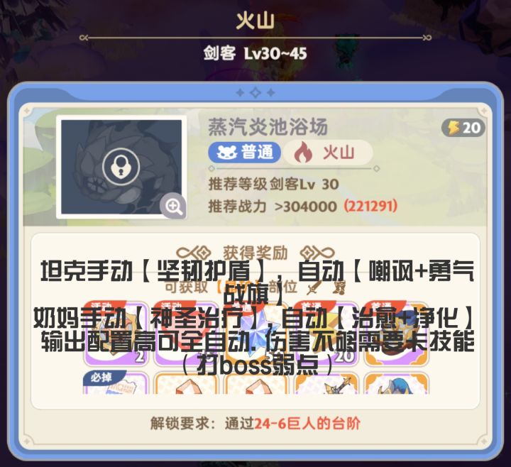 坦克:手动【坚韧护盾】boss释放深渊巨口时,自动【嘲讽+勇气战旗】奶妈:手动【神圣治疗】boss释放熔岩喷射时,自动【治愈+净化】输出配置高(别带打断)可全自动. 伤害不太够需留好技能爆发(留好输出技能第一时间点击boss弱点)要点注意:留技能-第一时间点击弱点-避免因为输出不够失败插播:134413 麦乐奇幻 旅团招伙伴啦,欢迎一区休闲上班族学生党熬夜党加入一起游玩#冒险攻略 #