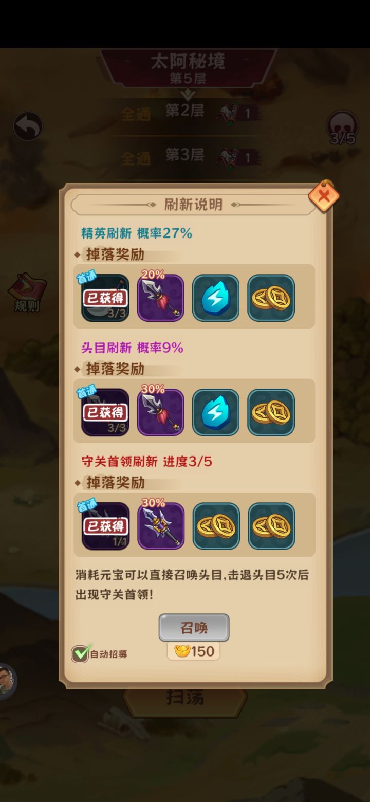 最近几天游戏多了不少新玩家,说明游戏还是有活力的,能吸引越来越多的玩家加入关于秘境,是玩家最主要提升的一个玩法,尤其前期的太阿秘境,能快速获取装备,对于新人来说,结合7天挑战的任务,尤为重要。但有的小伙伴就问了,为什么打一次才出一个boss,打来打去都还在第一关呢?因为秘境的设定,越高层数出boss的概率越大,只有5/5后打完本层的首领后才能进入下一关。