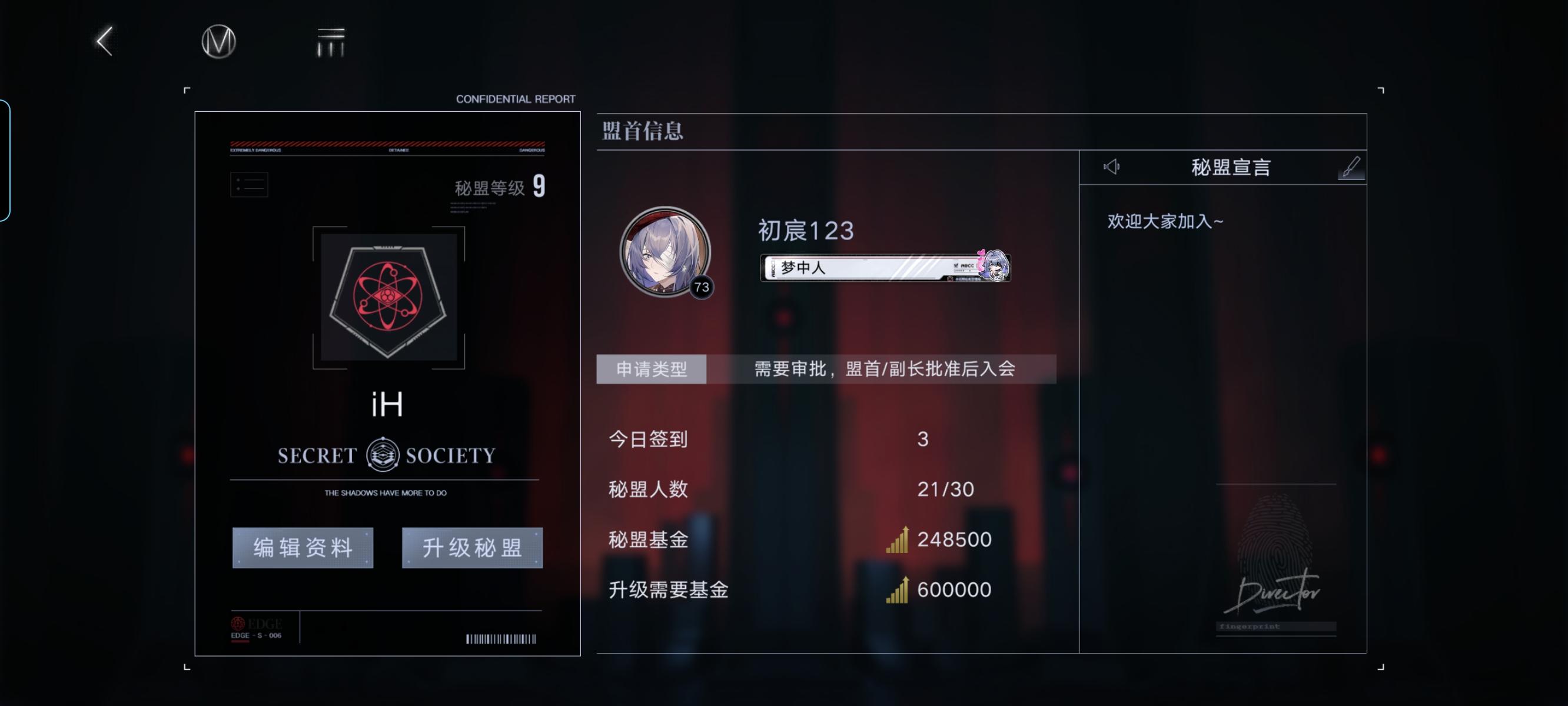 当前是八级盟 欢迎大家加入!每天要捐献 公会战要出刀 七天未上线当人机踢 学生党开学了个签写念书可不踢 先入盟再入盟群 可以一起讨论攻略#秘盟招人#米诺斯